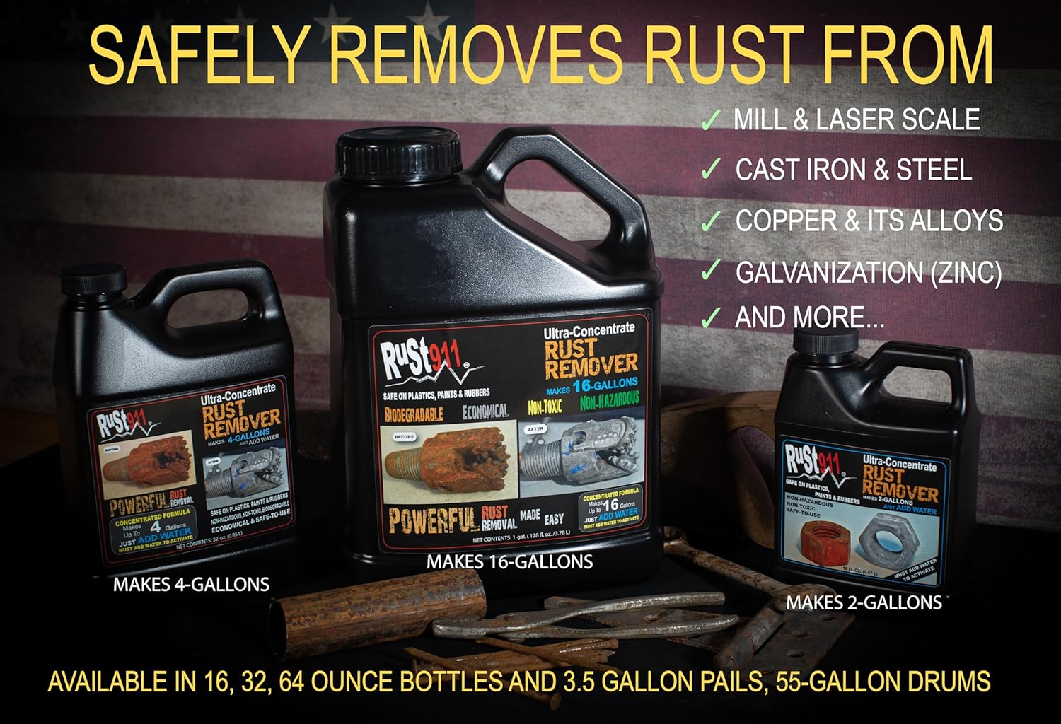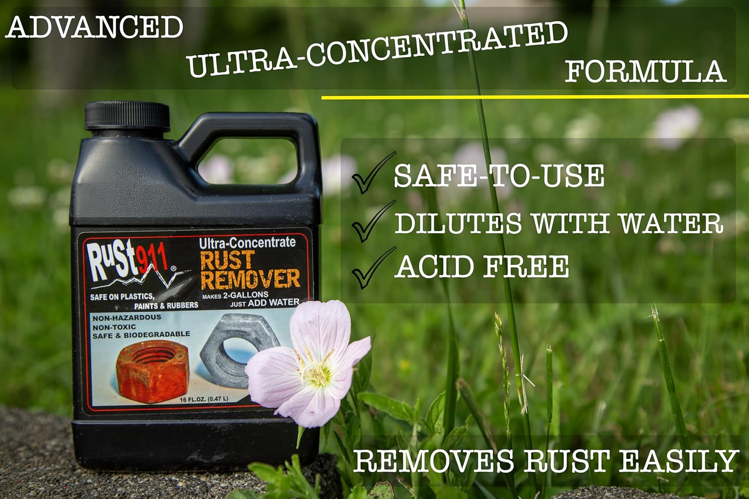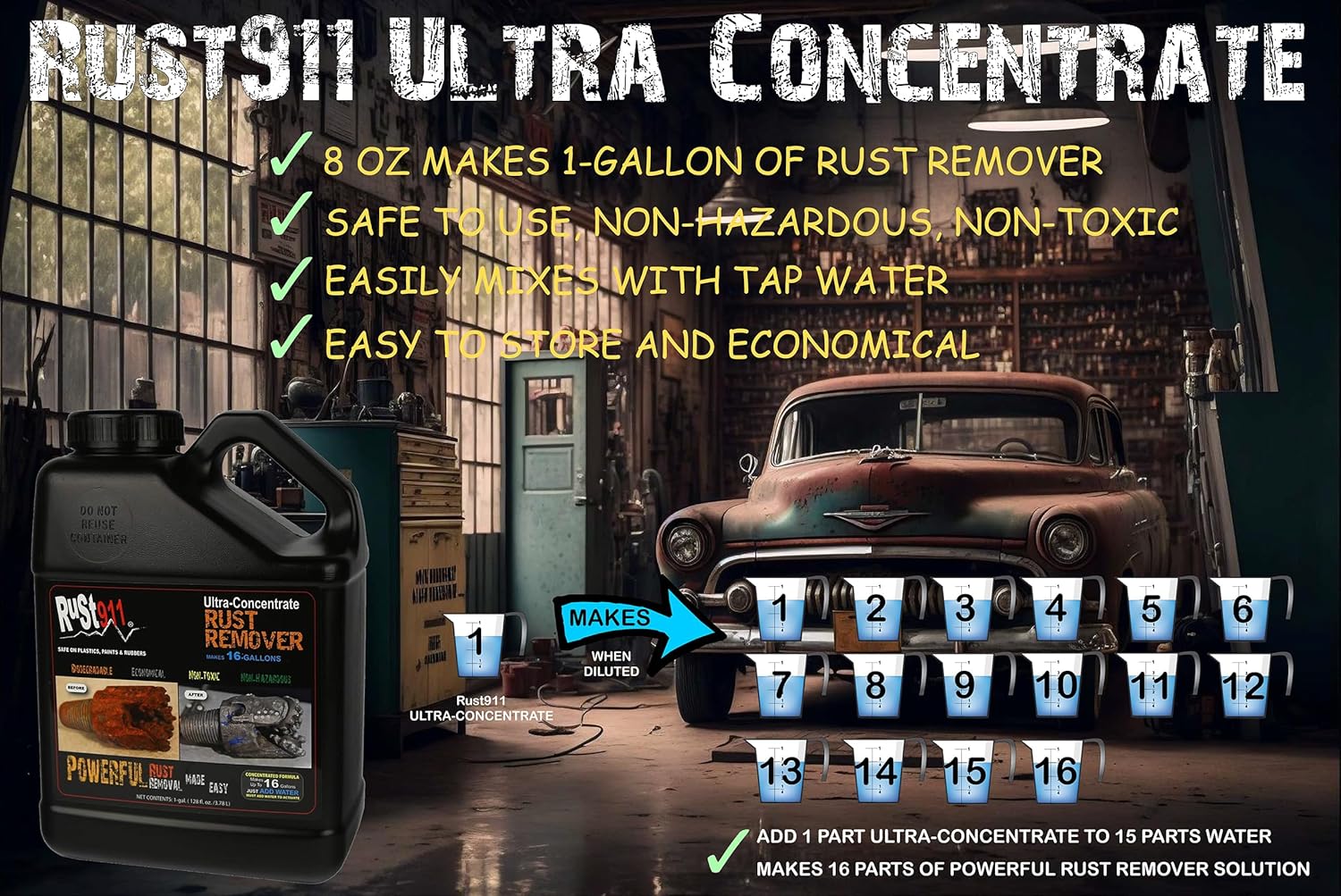 O Rust911 é a solução definitiva para a remoção de ferrugem, oferecendo um produto ultra-concentrado que transforma 1 galão em impressionantes 16 galões de solução poderosa. Este removedor de ferrugem é projetado para eliminar completamente a ferrugem sem a necessidade de lixar, moer ou utilizar produtos químicos agressivos. Com uma fórmula segura e gentil, o Rust911 é livre de ácidos, tornando-se uma opção não tóxica e amigável para a pele, priorizando a segurança do usuário.