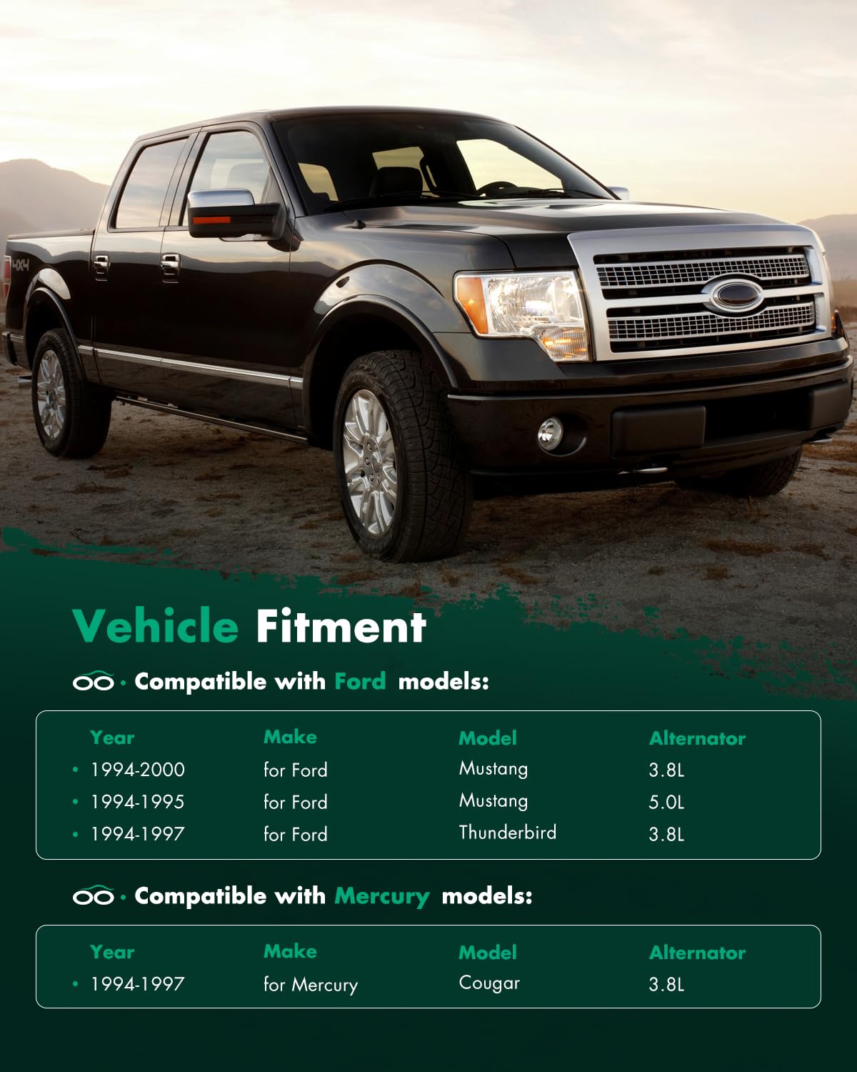 - Compatibilidade do Alternador: Este alternador é um substituto automotivo novo e compatível com os seguintes modelos: Ford Mustang (1994-2000), Ford Thunderbird (1994-1997) e Mercury Cougar (1994-1997).