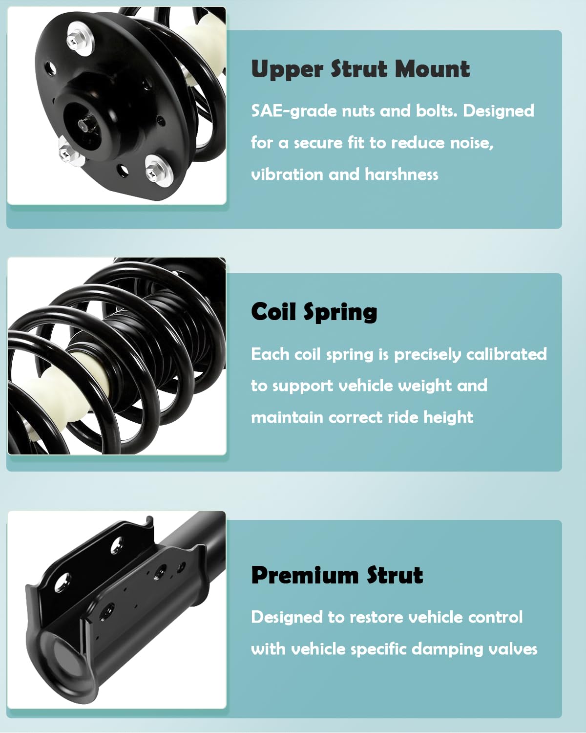 - INCLUDES: O kit inclui 2 peças de amortecedores frontais (esquerdo e direito) e 2 peças de amortecedores traseiros (esquerdo e direito). Cada montagem de amortecedor é composta por um estrado, mola helicoidal, suporte de estrado, bota, kit de batente, assento da mola e isolador, proporcionando uma solução completa para o seu veículo.