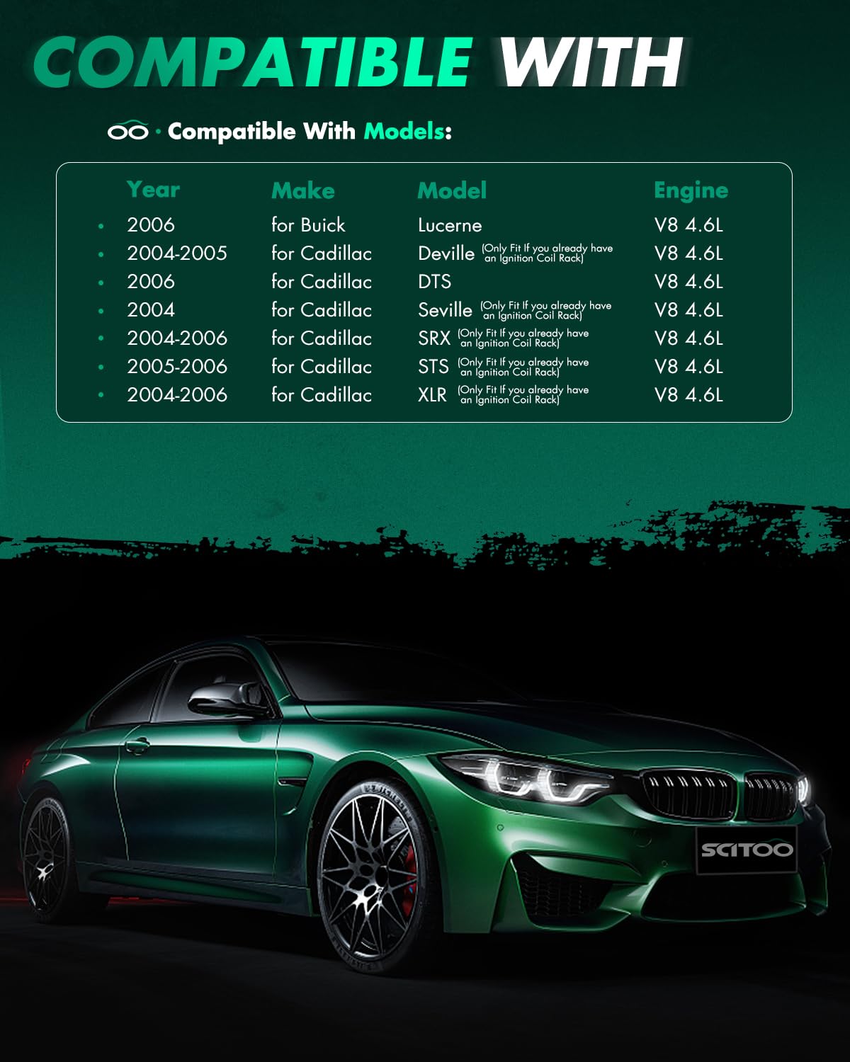 O SCITOO Ignition Coil Coils Pack é a solução ideal para quem busca desempenho e confiabilidade em veículos como o Pontiac Bonneville 4.6L (2004-2005), Cadillac XLR 4.6L (2004-2005), Cadillac STS 4.6L (2005-2006), Cadillac SRX 4.6L (2004-2006), Cadillac Seville 4.6L (2004), Cadillac DeVille 4.6L (2004-2005) e Buick Lucerne 4.6L (2006). Este pacote de bobinas de ignição é projetado para substituir componentes originais, garantindo que seu motor funcione de maneira eficiente e suave.