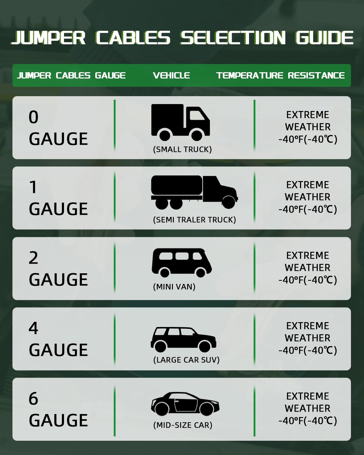 If I have to have a negative for this it would be the length. Although 30′ of cable certainly makes it easy to pull up a car next to yours and not have to worry about being hood to hood just to get your jumper cables to reach…it is quite a bit of cable to store in your car all the time. Regardless, I absolutely love these jumper cables. They are actually thicker, longer and nicer (clamps have copper section where my original ones did not) than what I had (even when it was new back in 1986). I 1000% recommend these jumper cables especially for the price they are selling for! Also…they threw in a tire flat repair kit for free (not sure if they do that with all of their orders, but they did with this one).