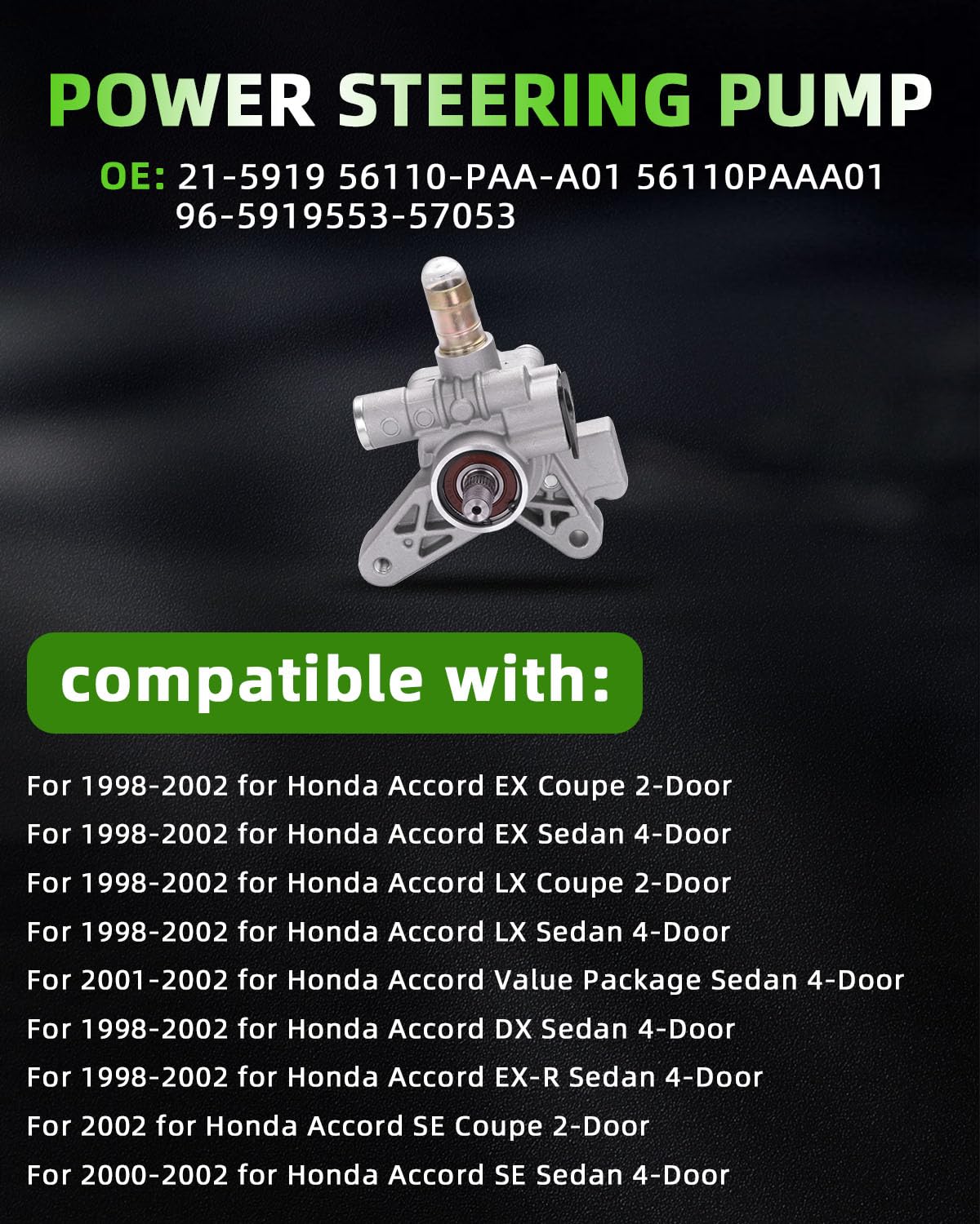 - VEÍCULOS COMPATÍVEIS: Bomba de assistência para Honda Accord dos anos 1998, 1999, 2000, 2001 e 2002.