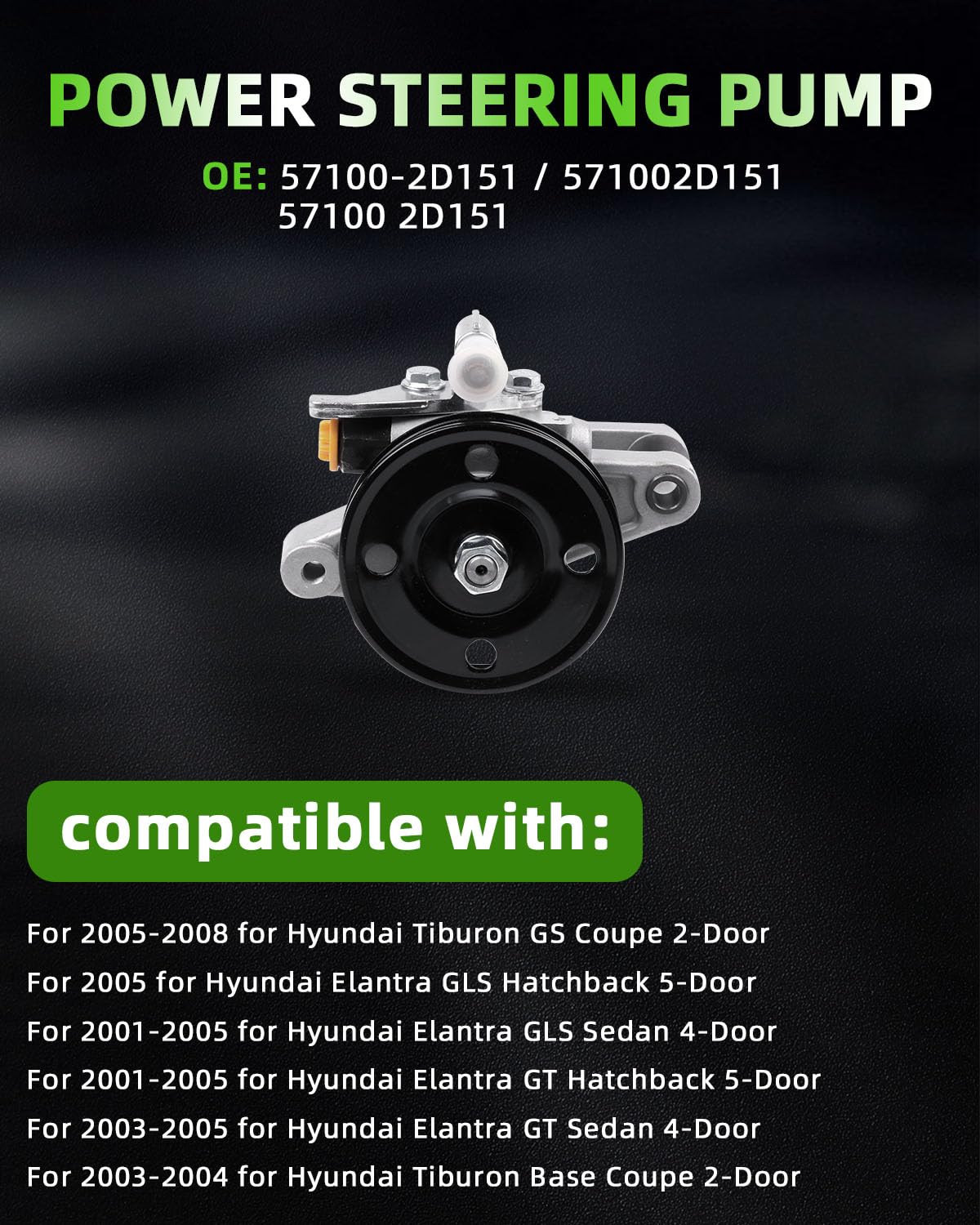 - VEÍCULOS COMPATÍVEIS: Bomba de Assistência para Hyundai Elantra 2001, 2002, 2003, 2004, 2005 L4 2.0L DOHC; para Tiburon 2003, 2004, 2005, 2006, 2007, 2008 L4 2.0L DOHC.