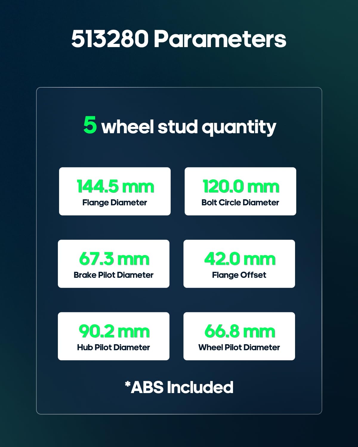 • ESPECIFICAÇÕES E PARÂMETROS – Equipado com 5 parafusos, eixo dianteiro e suporte para ABS, o desempenho OE assegura que não haja ruídos anormais ou conexões defeituosas.