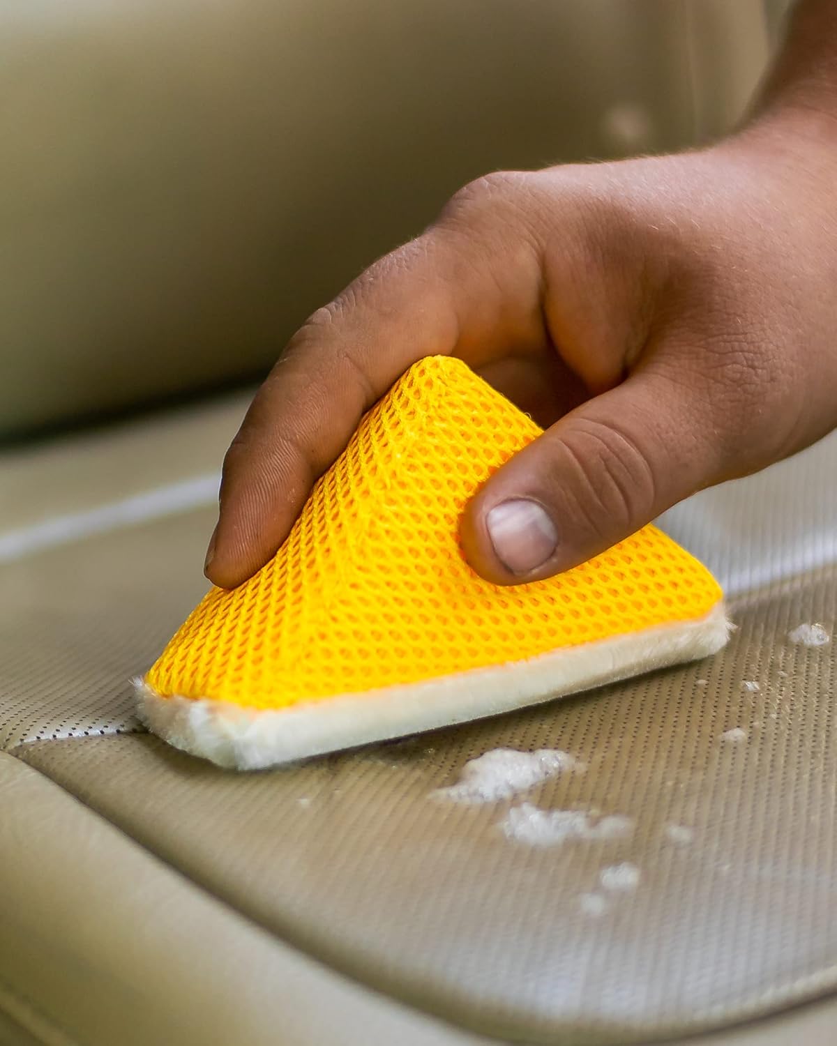 A tecnologia de tecido com cerdas tipo escova é o que diferencia o Scrub Ninja de outros produtos no mercado. As fibras firmes, mas gentis, penetram profundamente nos poros e contornos dos tecidos, garantindo uma limpeza eficaz sem danificar as superfícies. O design em cunha não só proporciona uma pegada confortável, mas também maximiza a eficiência ao limpar áreas de difícil acesso, como os cantos dos bancos e as fendas do painel.