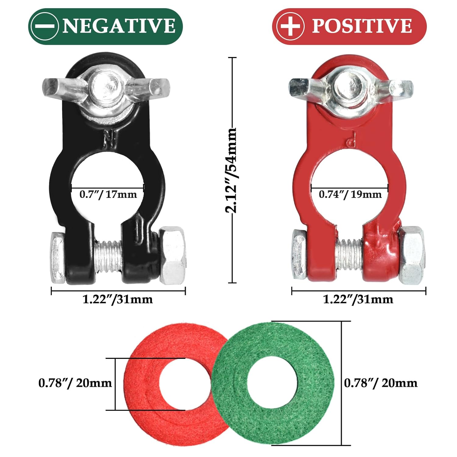 – Dimensões: Terminal positivo (0,67-0,75 polegadas / 17-19 mm), terminal negativo (0,59-0,67 polegadas / 15-17 mm).