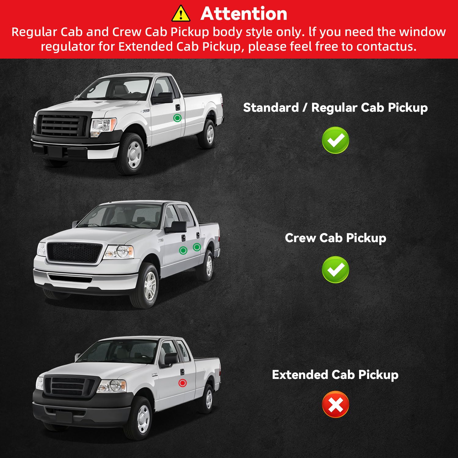 Resposta: Este regulador é compatível apenas com as versões Cabine Regular e Crew Cab do Ford F150 de 2004-2008. Não é compatível com Super/Extended Cab ou Heritage.