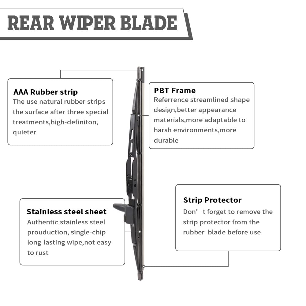 These rear window wiper blades are perfect aftermarket replacements. Packaging was excellent, easy installation, and next-day delivery on Prime. The 2-pack is awesome for a spare backup, and a nice cleaning cloth made the purchase over the top on my expectations of an aftermarket product.