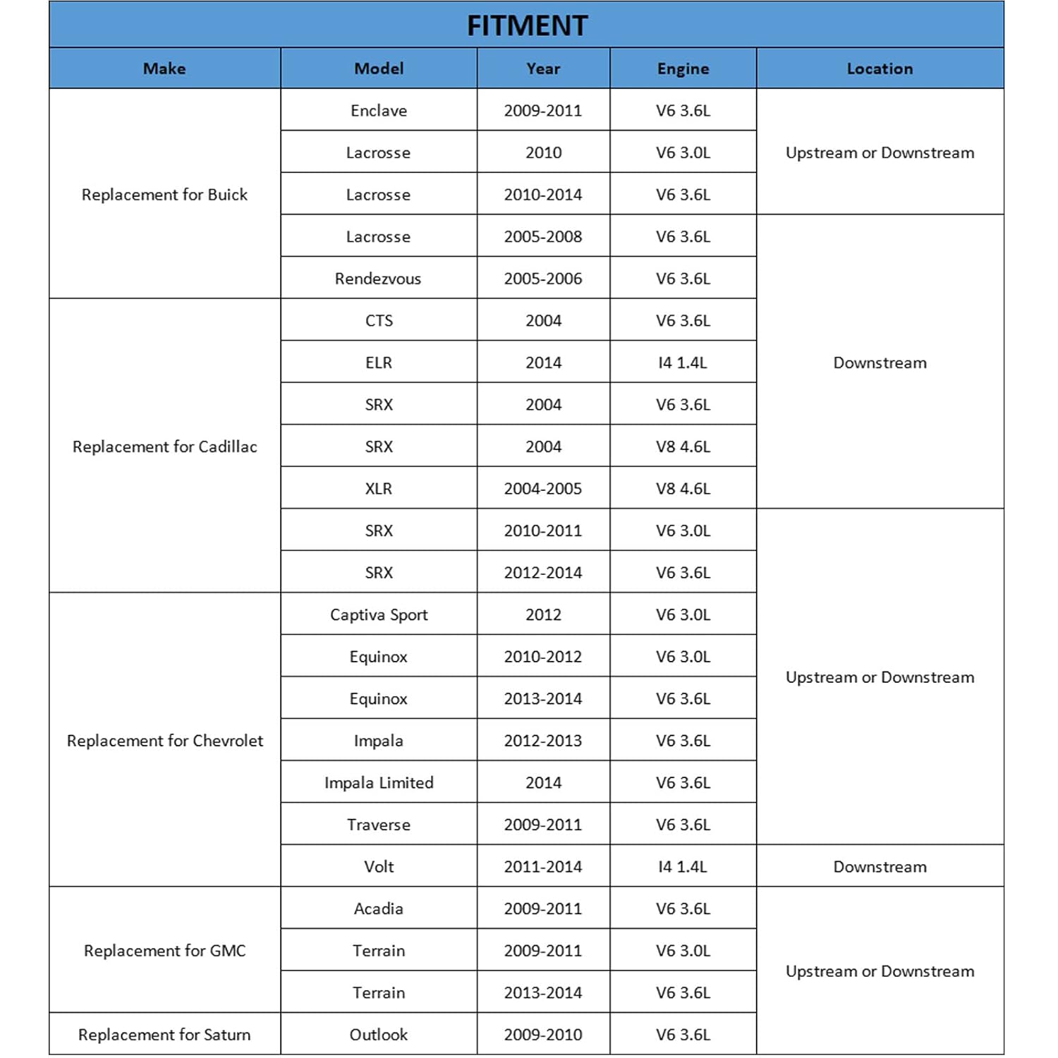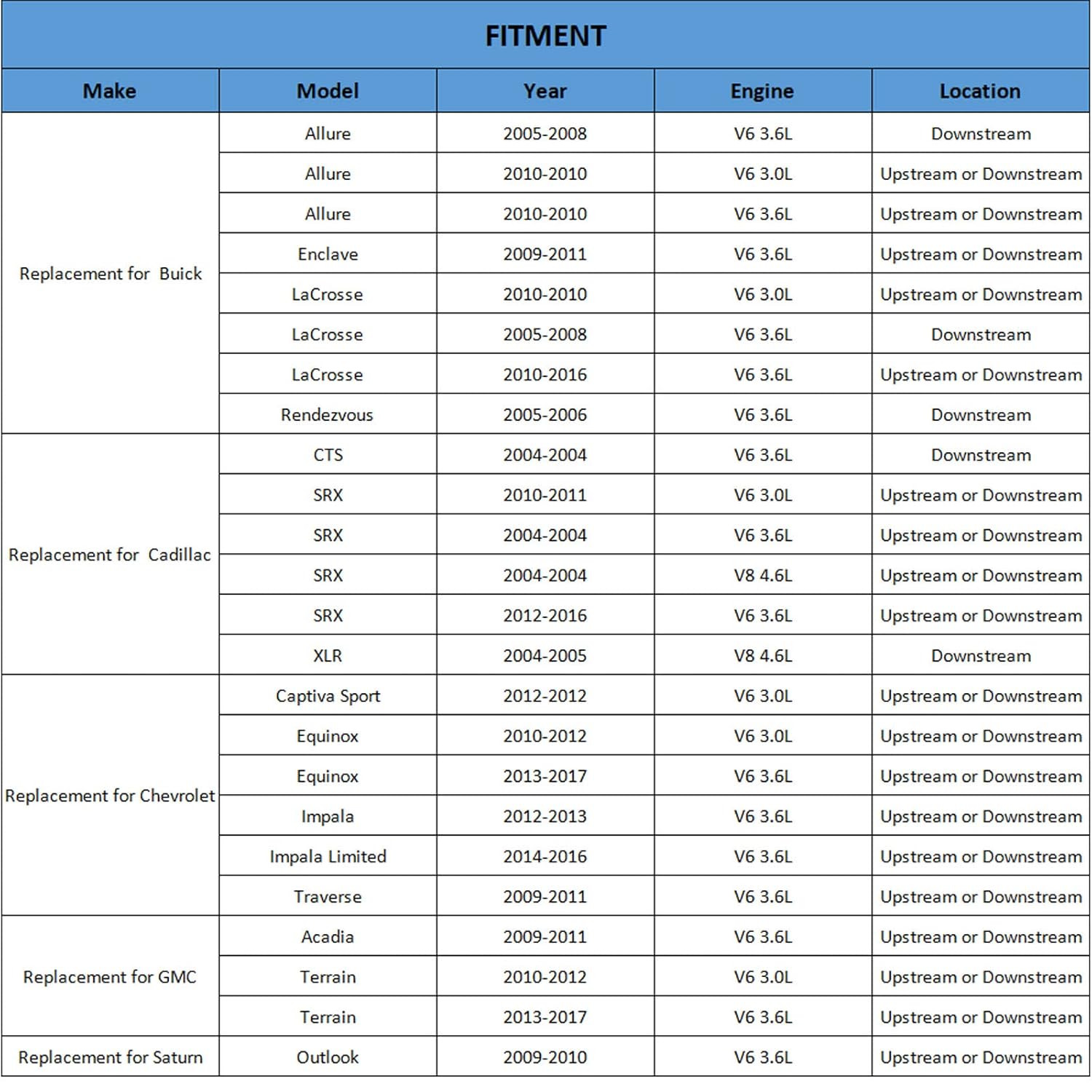 – GMC: Acadia (2009-2011 V6 3.6L), Terrain (2010-2012 V6 3.0L, 2013-2017 V6 3.6L).