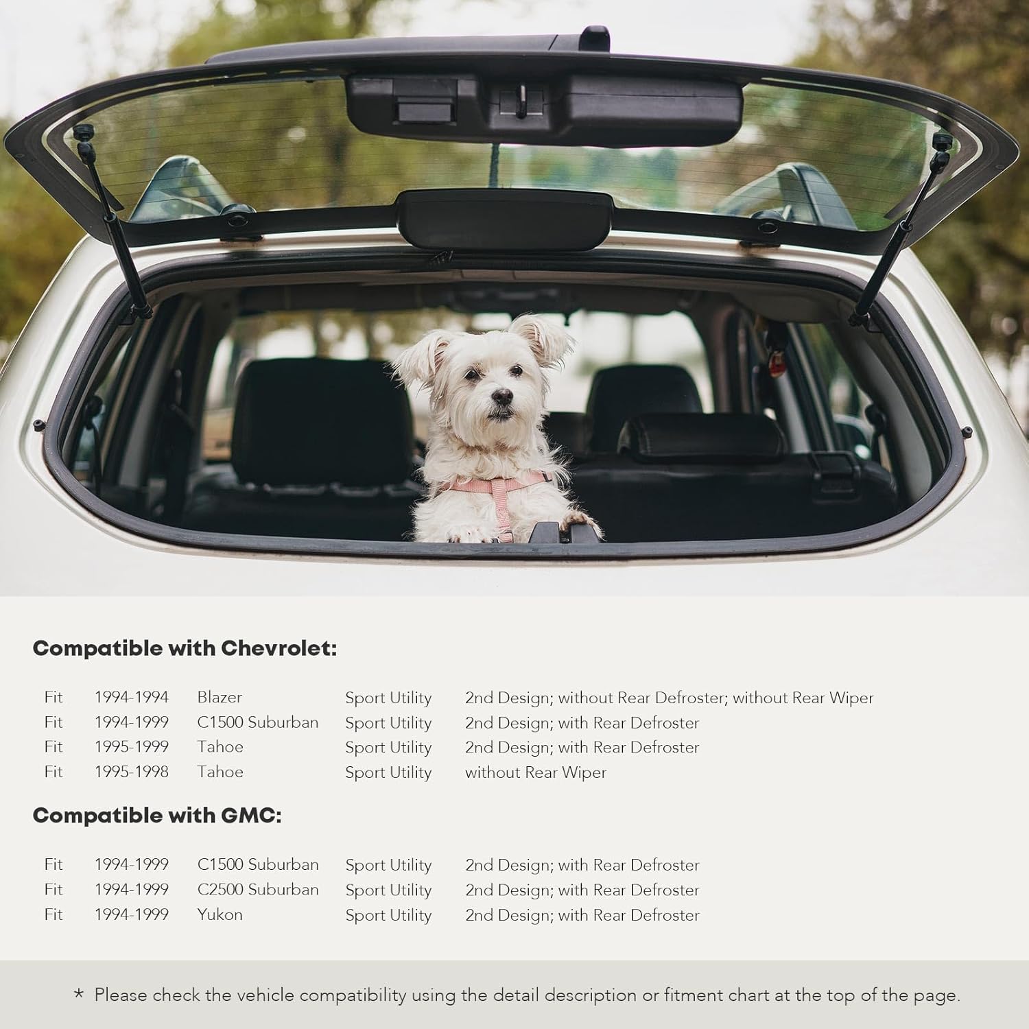 Esses suportes são compatíveis com uma variedade de modelos, incluindo o Chevrolet Blazer 1994, C1500 Suburban de 1994 a 1999 e Tahoe de 1995 a 1999, além dos GMC C1500/C2500 Suburban de 1994 a 1999 e Yukon de 1994 a 1999. É importante ressaltar que eles se encaixam apenas em modelos com o segundo design e com desembaçador traseiro. Para o Chevrolet Blazer de 1994, a compatibilidade é restrita a modelos sem desembaçador traseiro e sem limpador traseiro. Para o Chevrolet Tahoe de 1995 a 1998, também se aplicam modelos sem limpador traseiro.