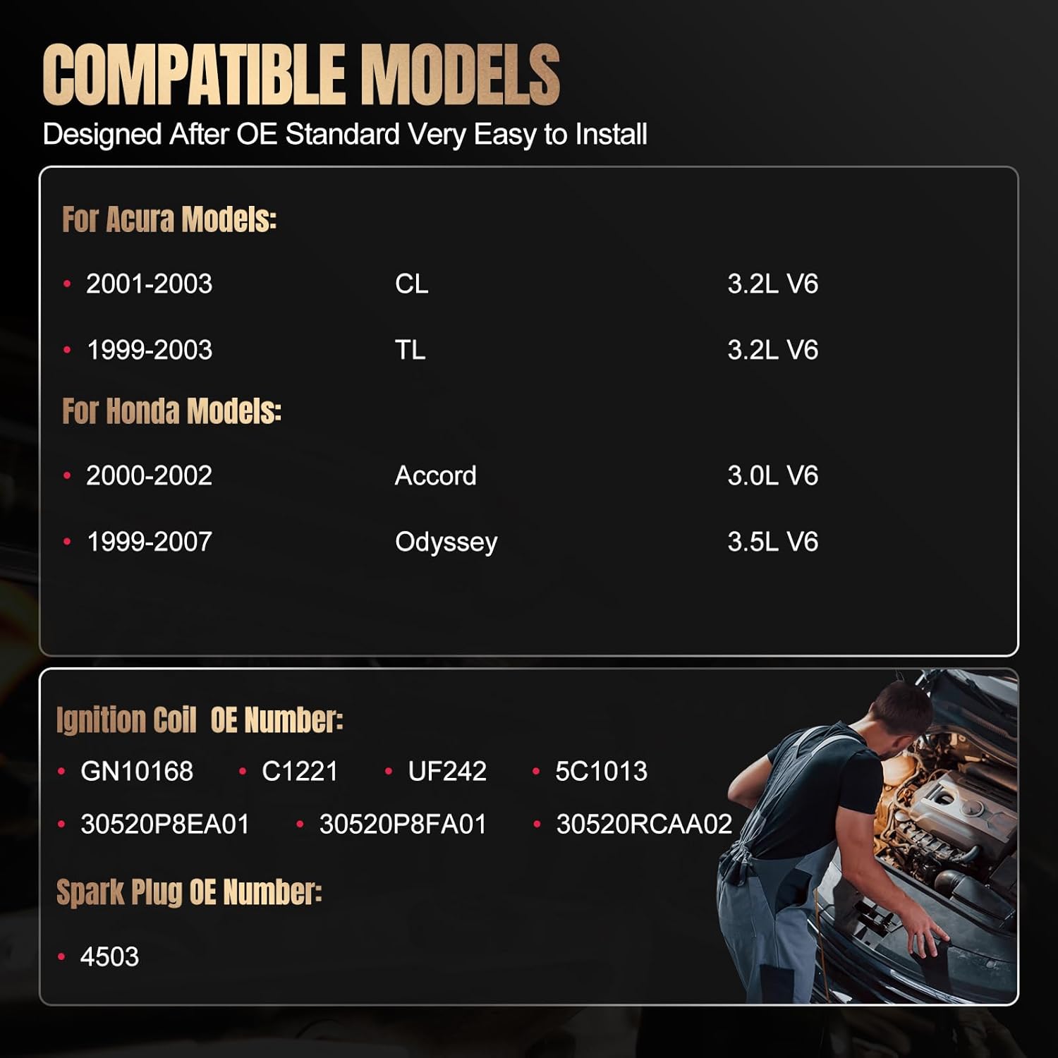O conjunto de 6 bobinas de ignição UF242 e 6 velas de ignição 4503 é a solução ideal para quem busca desempenho e confiabilidade em veículos como o Acura TL e CL de 2001 a 2003, além de modelos Honda. Com compatibilidade garantida para o Acura CL 3.2L V6, Acura TL 3.2L V6, Honda Accord 3.0L V6 e Honda Odyssey 3.5L V6, este kit é projetado para atender às necessidades específicas de ignição desses motores.