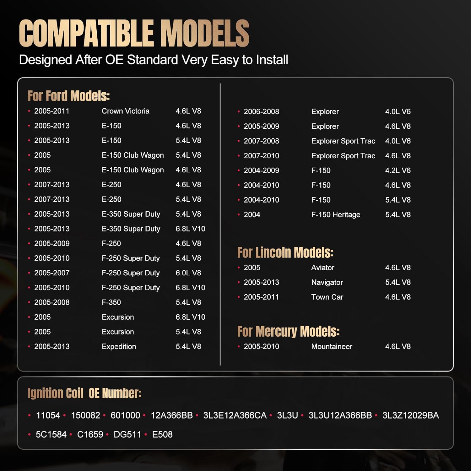– Compatibilidade Multiveículo: As bobinas DG511 são compatíveis com uma vasta gama de modelos, como E-150, E-250, E-350 Super Duty, F-150, F-250, F-350, Lincoln Aviator, Navigator e Town Car. Para verificar a compatibilidade, consulte a imagem ou a página de detalhes.