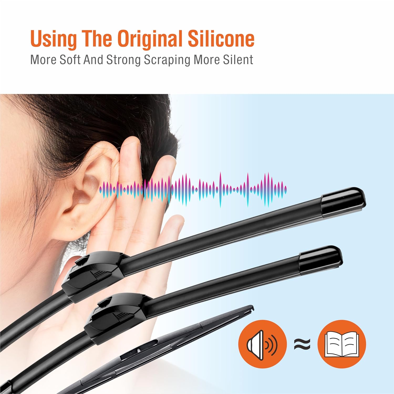 【Wiper Performance】 Diferente dos limpadores de borracha tradicionais, as lâminas de silicone WOWPIER não produzem ruído, evitando tremores e embaçamento severo. O revestimento de silicone orgânico bloqueia a entrada de água nas fendas, transformando-a em gotas que escorrem naturalmente para baixo. Essa impermeabilidade robusta garante visibilidade superior e segurança ao dirigir em chuvas intensas.