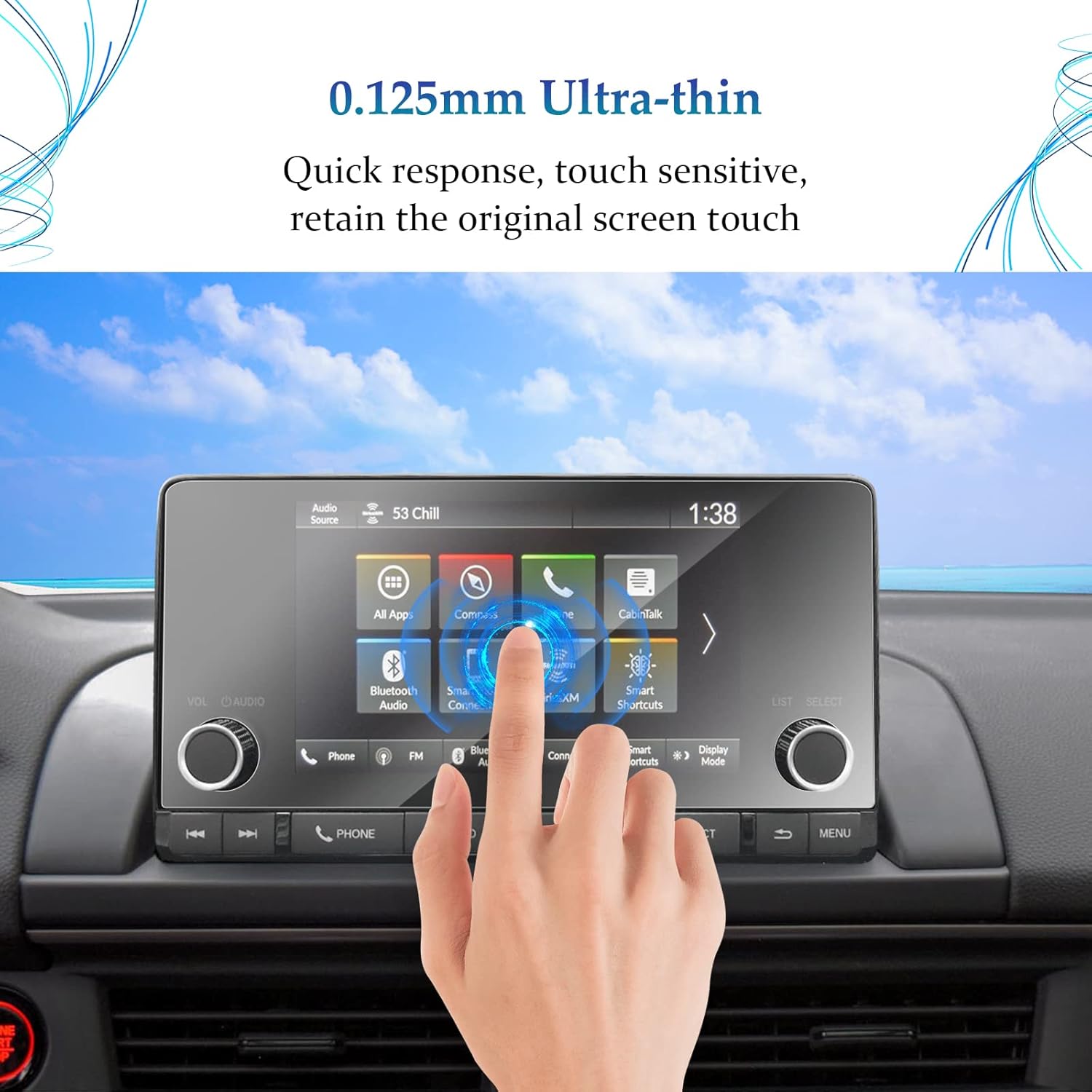 Awesome fits great for wife’s 25 Honda pilot. Easy install should help protect screen. Same thickness is a normal phone screen protector.