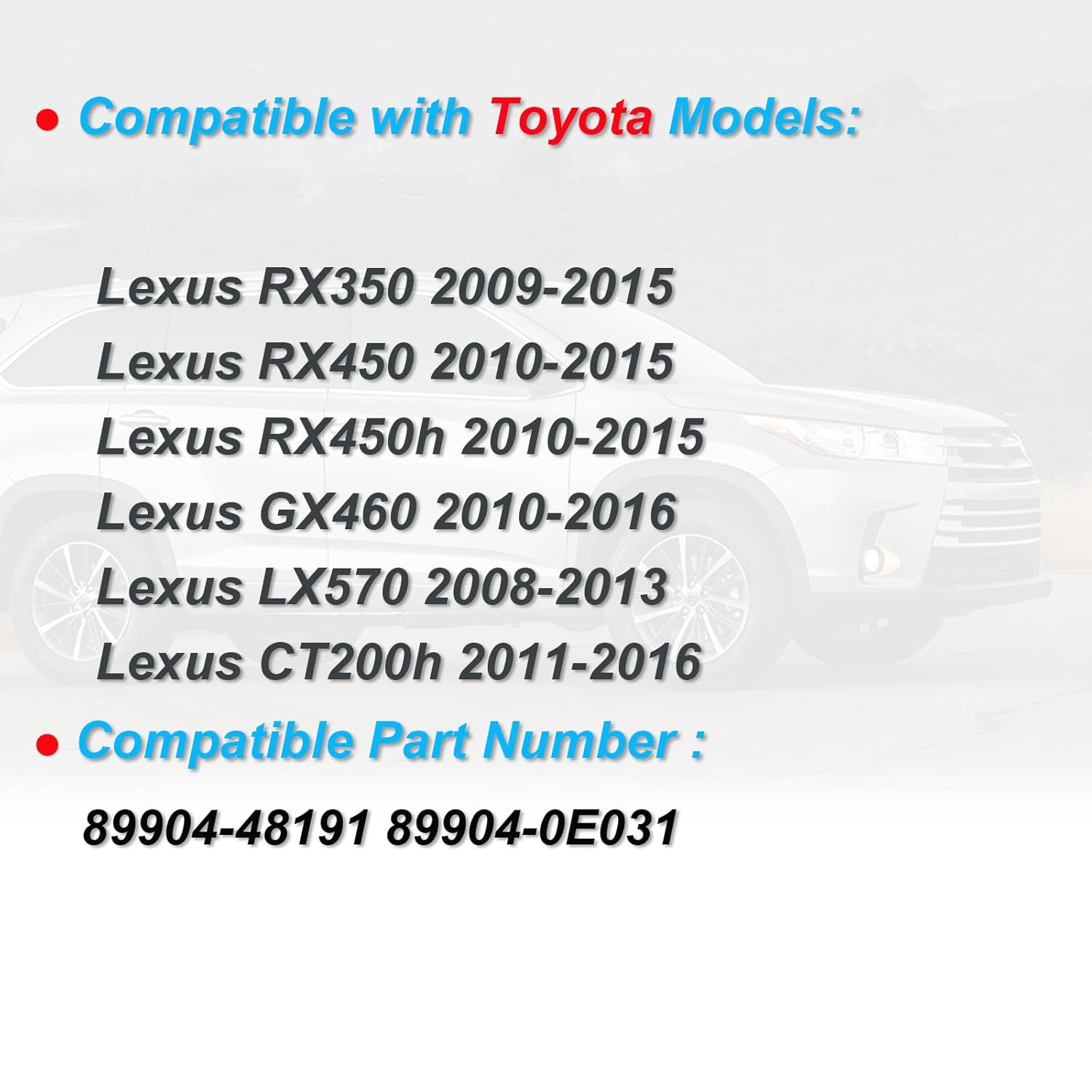 – Compatibilidade: Projetado para Lexus RX350 (2009-2015), RX450 (2010-2015), RX450h (2010-2015), GX460 (2010-2016), LX570 (2008-2013) e CT200h (2011-2016).