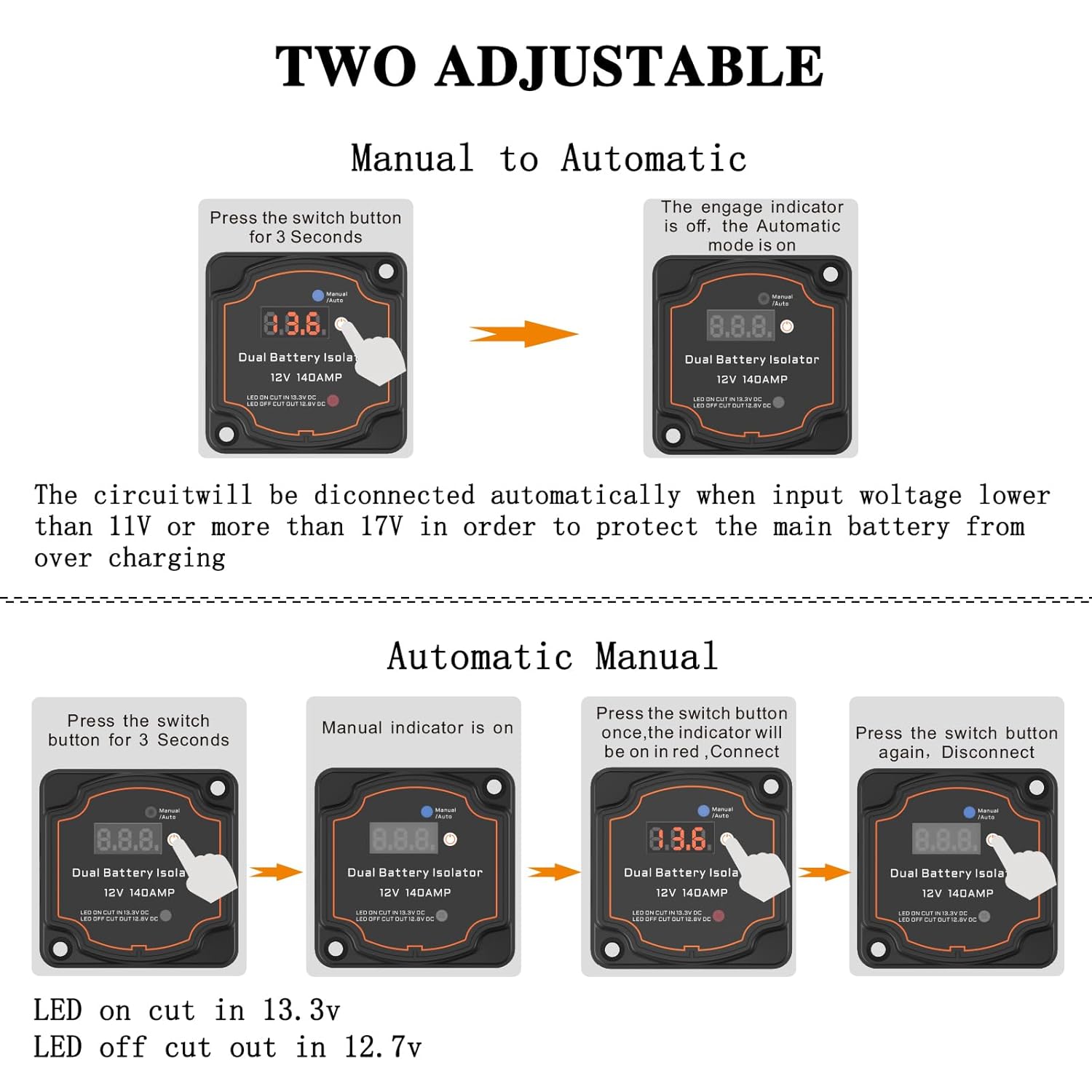 Com um design robusto e à prova d’água (classificação IP68), o isolador é projetado para suportar as mais diversas condições climáticas, permitindo que você viaje sem preocupações. O relé inteligente desliga automaticamente o circuito quando a voltagem de entrada cai abaixo de 11V ou ultrapassa 17V, protegendo assim a bateria principal contra sobrecargas e descargas excessivas.