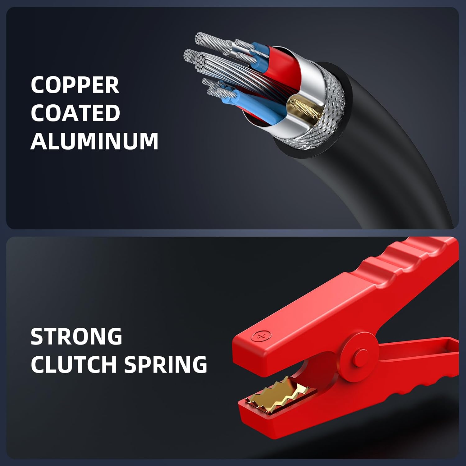 Fabricados com materiais de alta qualidade, os Smart Jumper Clamps são construídos para durar. Com um cabo de alumínio revestido de cobre e grampos de cabo com mola de alta resistência, esses grampos oferecem uma condutividade excepcional e uma durabilidade que se destaca no mercado. A proteção abrangente é uma das principais características deste produto, que conta com um sistema de 10 proteções inteligentes. Entre elas, estão a proteção contra sobretensão, proteção contra sobrecorrente, proteção contra polaridade reversa, proteção contra altas temperaturas, proteção contra alta voltagem, proteção contra curto-circuito, proteção contra descarga excessiva e proteção contra conexão reversa. Isso garante que você possa usar os grampos com total confiança, sabendo que sua segurança e a do seu veículo estão em primeiro lugar.
