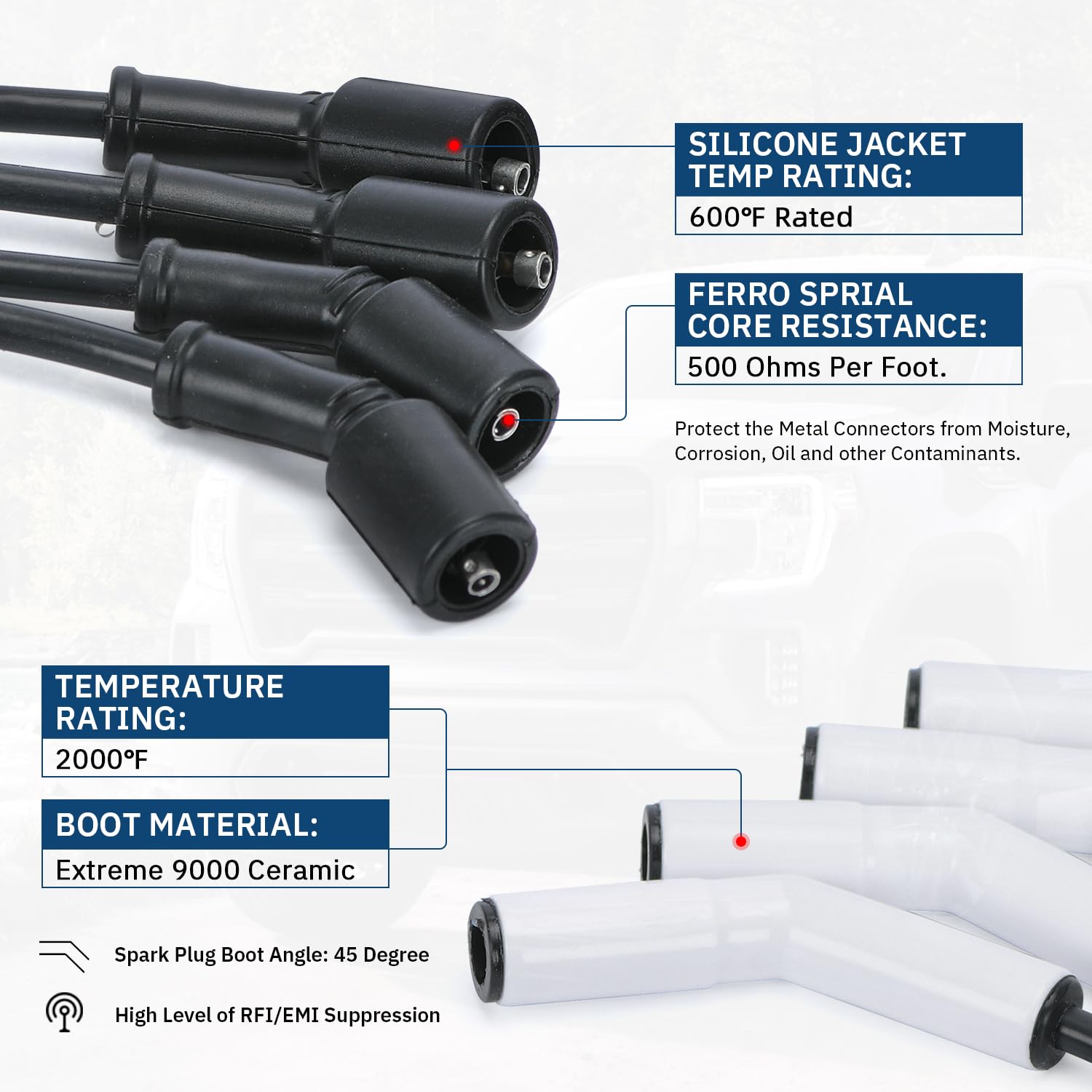 Os cabos deste conjunto possuem botas cerâmicas na extremidade das velas, capazes de suportar temperaturas de até 2.000°F. O núcleo espiral de ferro apresenta uma resistência de 500 Ohms por pé, enquanto a construção em silicone dos fios tem uma classificação de temperatura de 600°F. Esses recursos garantem durabilidade e desempenho superior em condições extremas.