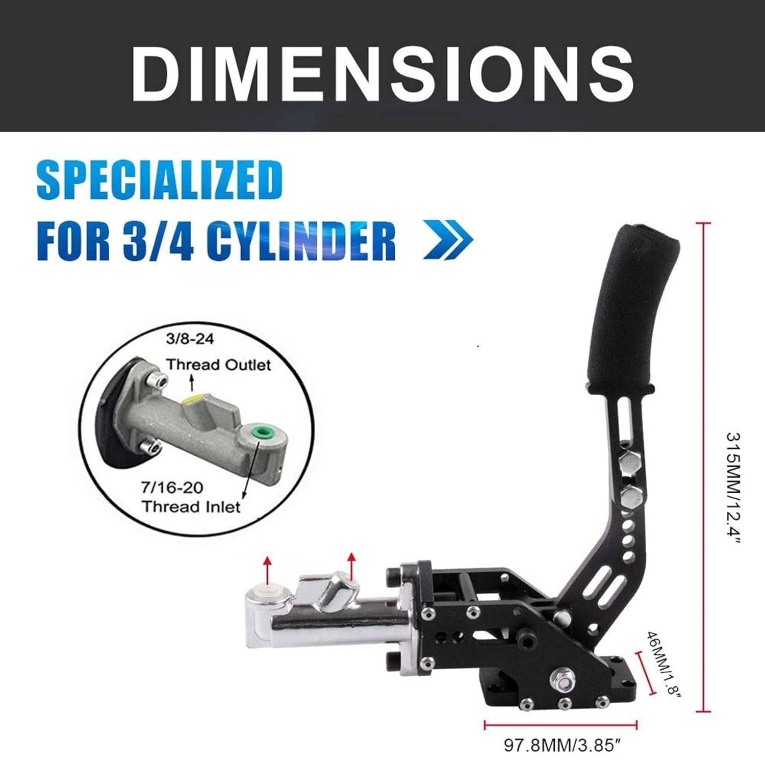 Nice handle. High strength. Note it can be reconfigured to get the handle closer to floor such as in use with ’32 Ford. Can also rotate the cylinder 180 degrees to point the connections down for easier pipe routing through your rods floor. Can also flip the locking catch over to drivers side that makes more sense, imho. NOTE: Read the diagrams closely to note the odd line fitting – the larger one really is 7/16 x 20 threading, NOT 7/16 x 24 you would expect. The 7/16 x 20 is not a common item to find at local parts store. But Amazon has them for both the 3/16″ and 1/4″ brake lines. $30 total, plus $20 (faster shipping), gets a bag of each size.