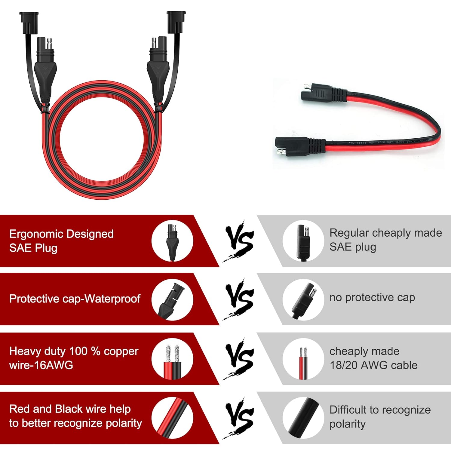 As cordas de 2 pinos, nas cores vermelha e preta, facilitam a identificação dos polos positivo e negativo, evitando confusões durante a instalação. O cabo é equipado com uma tampa protetora à prova d’água e poeira, que não só protege as conexões, mas também aumenta significativamente a vida útil do produto. O plugue SAE, com design ergonômico, permite uma conexão e desconexão rápidas, funcionando perfeitamente em diversas aplicações.