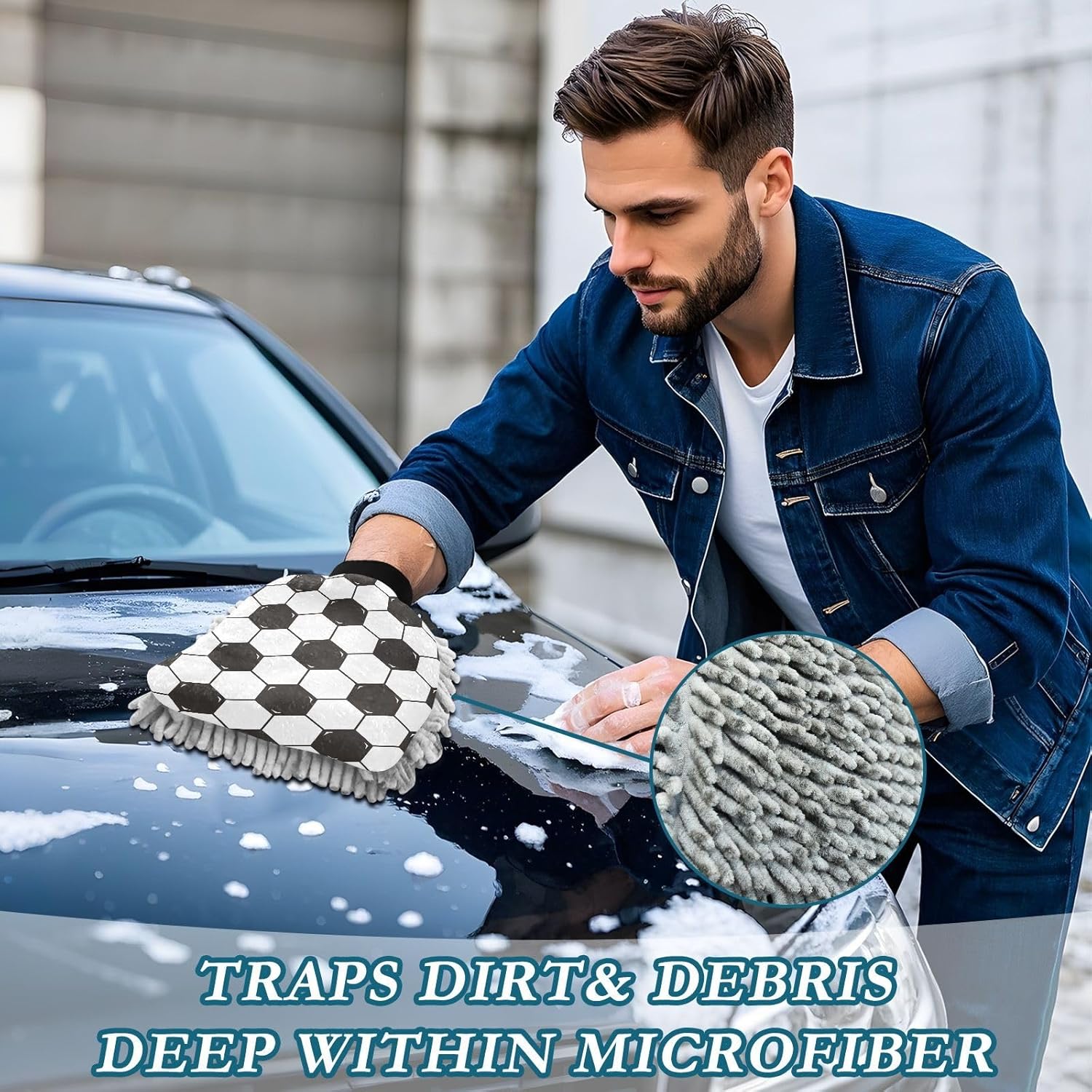 3. Lavagem: Comece a lavar o veículo, aplicando o mitt na superfície com movimentos suaves e circulares. O lado de chenille irá capturar sujeira e detritos sem arranhar a pintura.