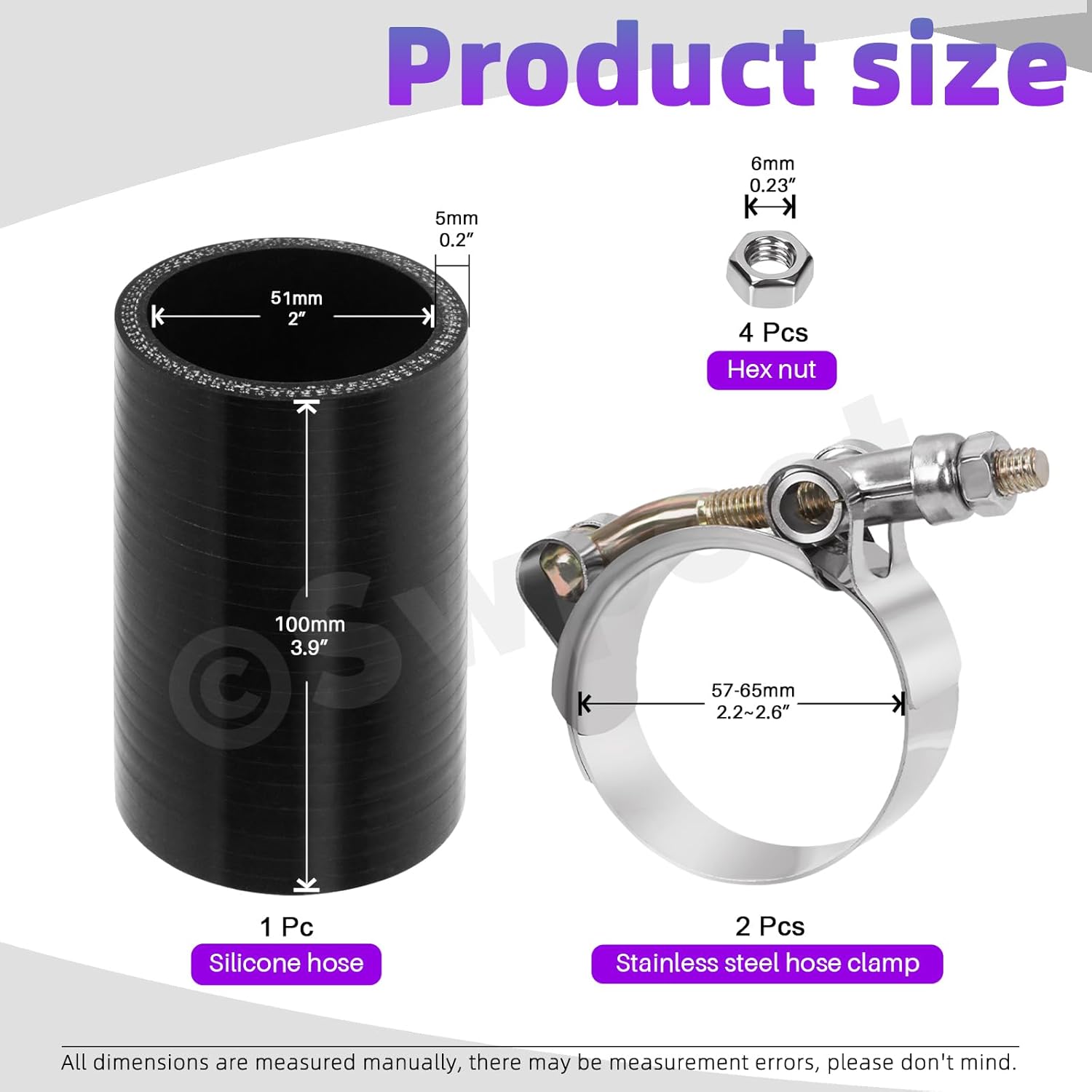 O Swpeet 7Pcs 2 Inch – 51mm 4-Ply Reinforced Straight Silicone Hose é a solução ideal para quem busca qualidade e desempenho em sistemas automotivos. Este kit inclui um mangueira de silicone reta de 2 polegadas (51mm) com 4 camadas de reforço, 2 grampos T de aço inoxidável e 4 porcas hexagonais de 6mm, totalizando 7 peças. A mangueira possui um diâmetro interno de 2 polegadas e uma espessura de 0,2 polegadas (5mm), garantindo uma conexão robusta e segura.