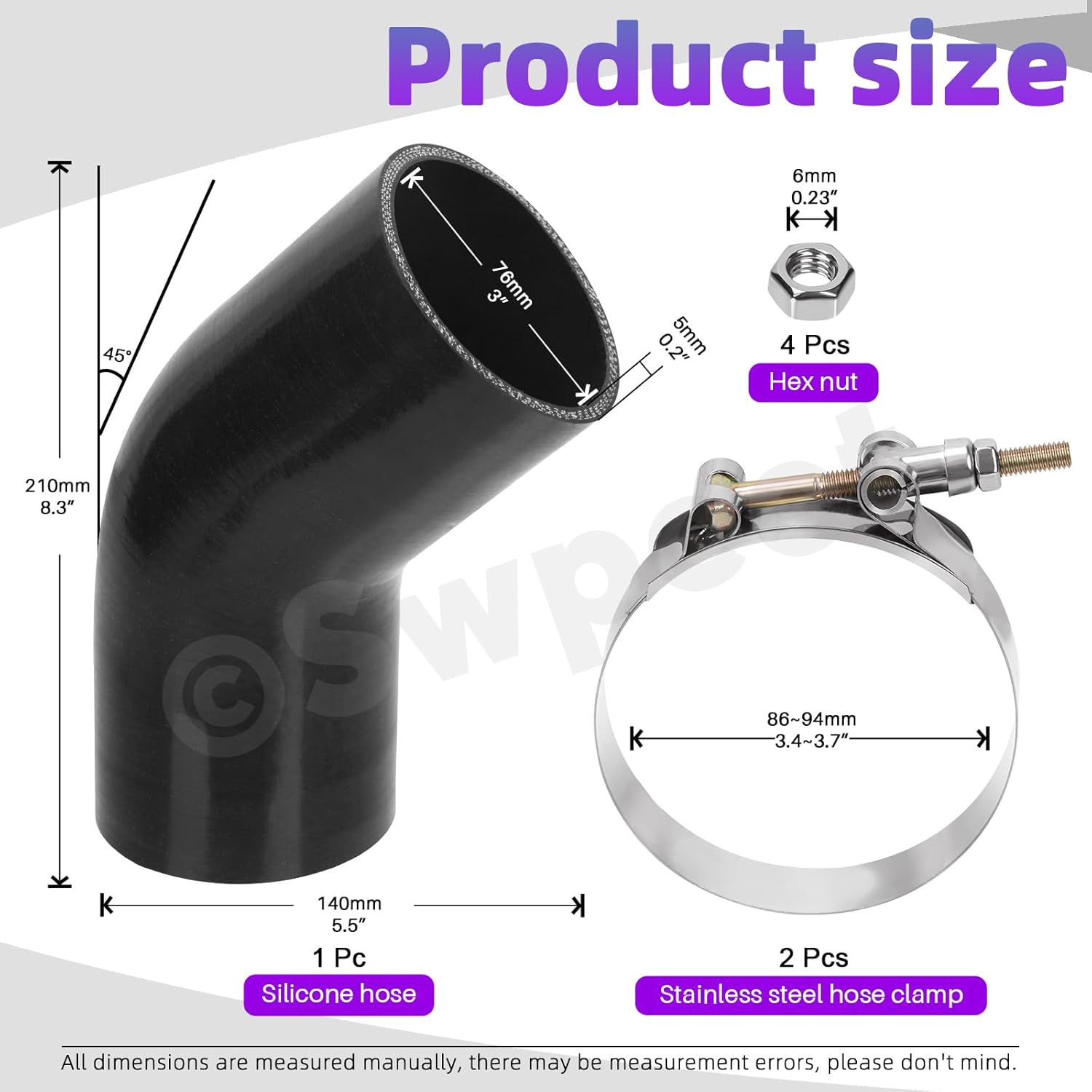 14 avaliações para Mangueira de Silicone Reforçada Swpeet 7Pcs 2 Polegadas – 51mm com Braçadeira T Bolt 57-65mm e Kit de Porcas Hexagonais 6mm para Turbo e Intercooler Automotivo