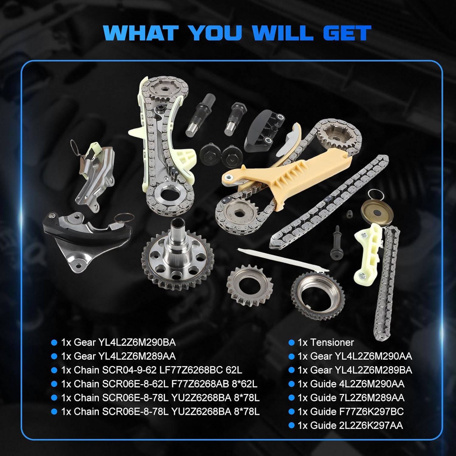 - Substitui Números de Peça: O Kit de Corrente de Distribuição substitui as peças OE: F77Z6268AB, YU2Z6268BA, LF77Z6268BC, entre outras, assegurando compatibilidade e qualidade.