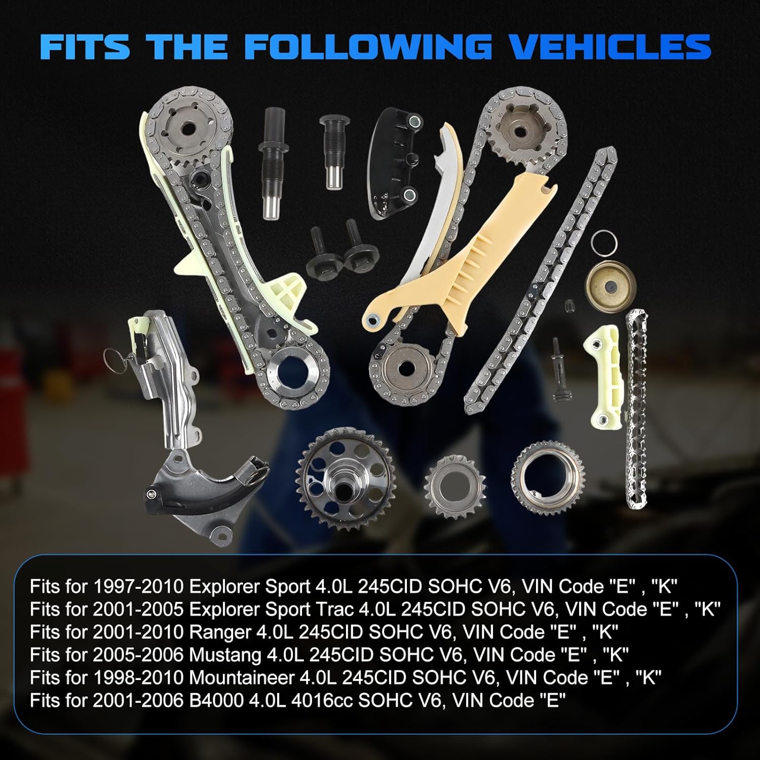 O Kit de Corrente de Distribuição é a solução ideal para quem busca qualidade e desempenho para os modelos de veículos Ford Ranger (2001-2010), Mountaineer (1998-2010) e B4000 (2001-2006) com motor V6 de 4.0L. Este kit é projetado para substituir as peças originais, garantindo que seu motor funcione de maneira suave e eficiente.
