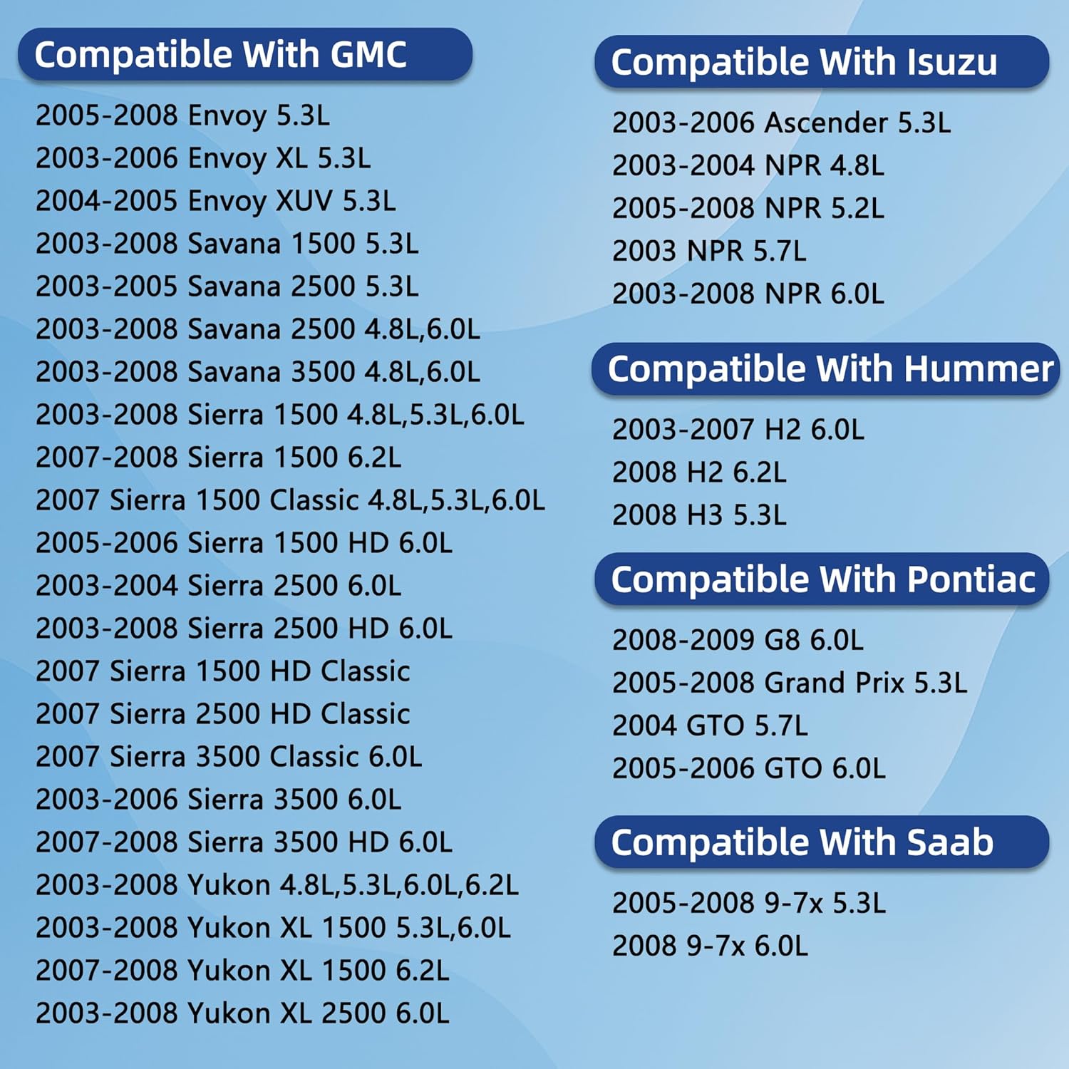 • Compatível com Chevy: 2007-2008 Avalanche 5.3L, 6.0L; 2003-2008 Silverado 1500 4.8L, 5.3L, 6.0L; 2003-2008 Express 1500 5.3L; 2003-2008 Tahoe 4.8L, 5.3L; e muitos outros modelos.