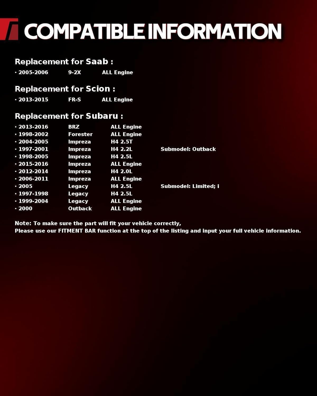 – Compatibilidade: Projetado para Subaru Impreza (1997-2016), Legacy (1997-2005), Forester (1998-2002), Scion FR-S (2013-2015) e outros modelos.
