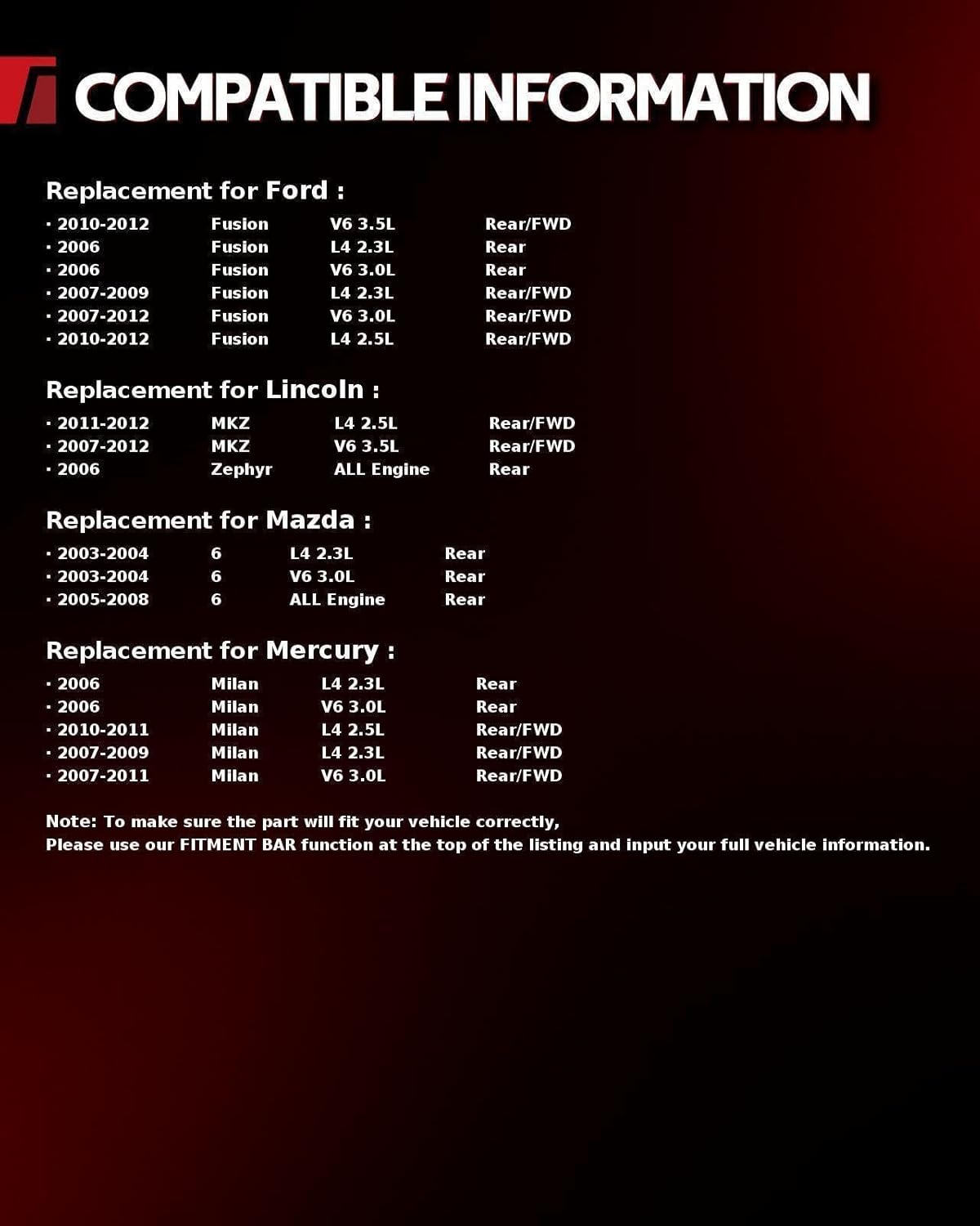 - [Compatibilidade] O conjunto de rolamento e cubo da roda é compatível com Ford Fusion FWD (2007-2012), Mazda 6 (2003-2008), Lincoln MKZ FWD (2007-2012), Mercury Milan FWD (2007-2011), Ford Fusion (2006), Lincoln Zephyr (2006) e Mercury Milan (2006).