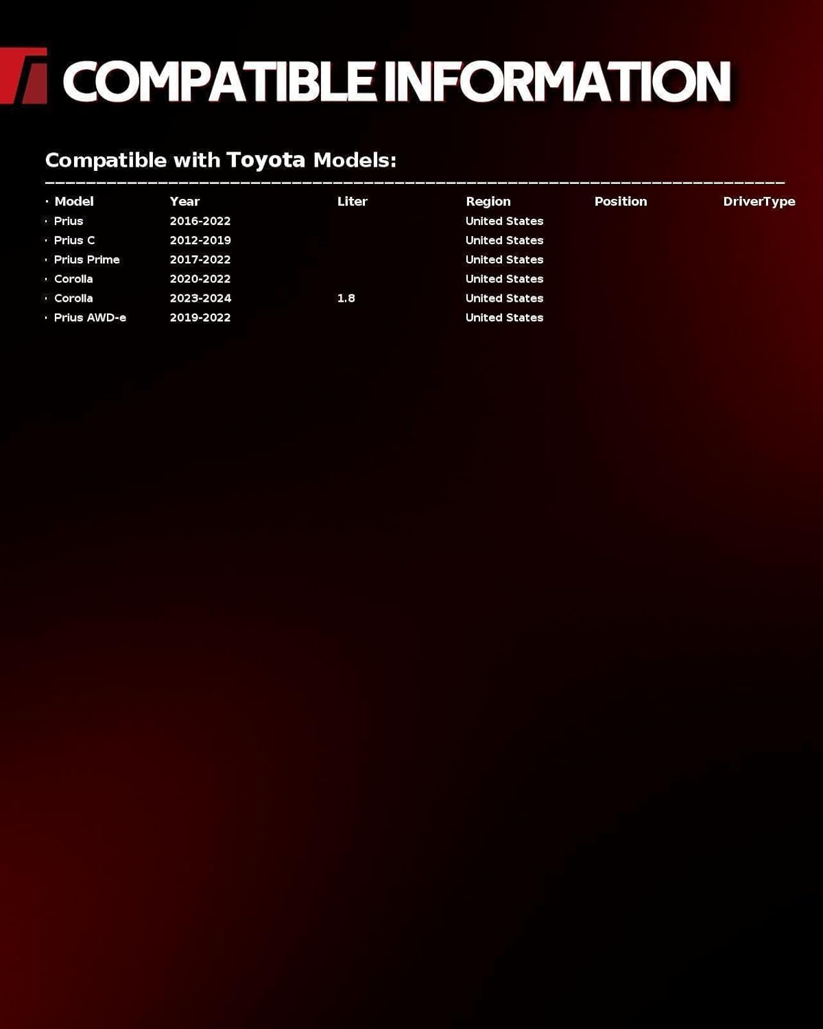 – Modelo Compatível: 2016-2022 Prius, 2012-2019 Prius C, 2020-2024 Corolla 1.8 FULL HYBRID EV-GAS (FHEV), 2017-2022 Prius Prime, 2019-2022 Prius AWD-e.
