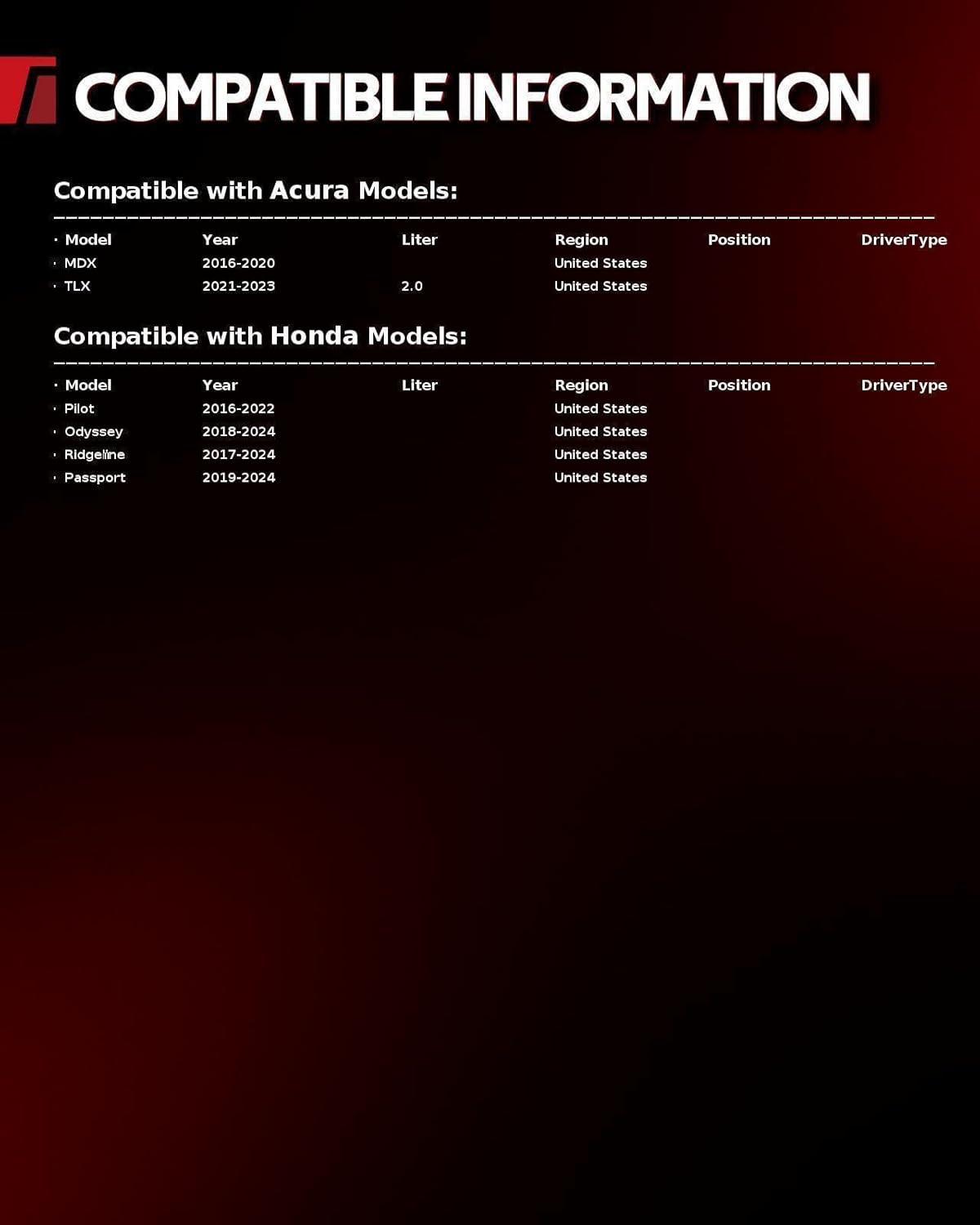 • Modelo Compatível: 2016-2022 Pilot, 2018-2024 Odyssey, 2016-2020 MDX, 2017-2024 Ridgeline, 2019-2024 Passport, 2021-2023 TLX