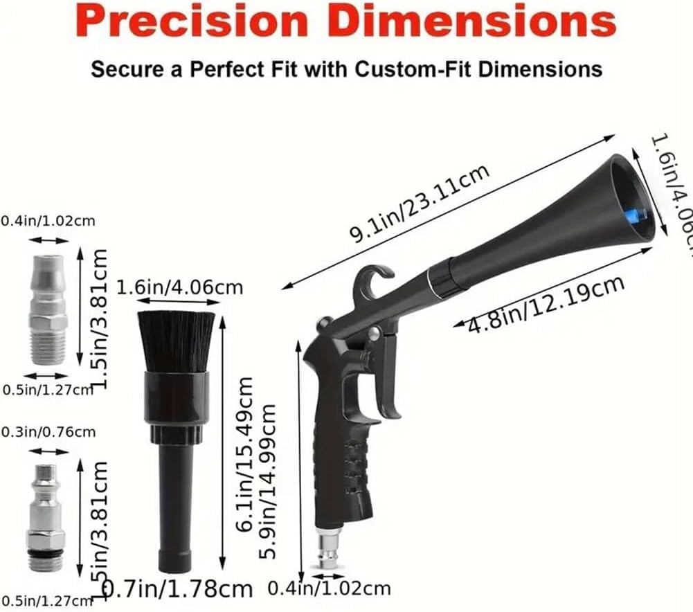 A Tornado Dry Cleaning Gun vem equipada com dois bicos intercambiáveis: um bico cônico que proporciona um fluxo de ar potente e uma escova de poeira macia, ideal para superfícies delicadas. Além disso, conta com um conector padrão dos EUA, permitindo que a ferramenta se adapte a diversas situações de limpeza. Esses acessórios facilitam o detalhamento do carro, alcançando áreas de difícil acesso com facilidade e eficiência.
