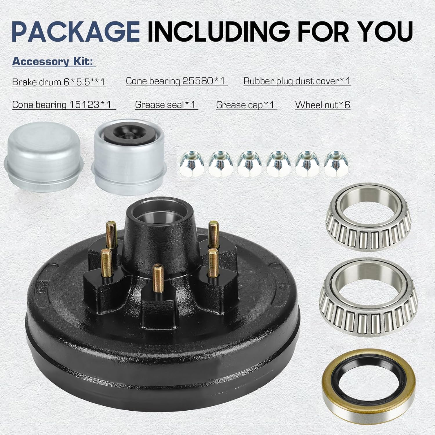 Resposta: O pacote inclui um tambor de freio, anéis internos de rolamento, selo de graxa, tampa de poeira, plugue de borracha e porcas de cubo, tudo o que você precisa para uma instalação completa.