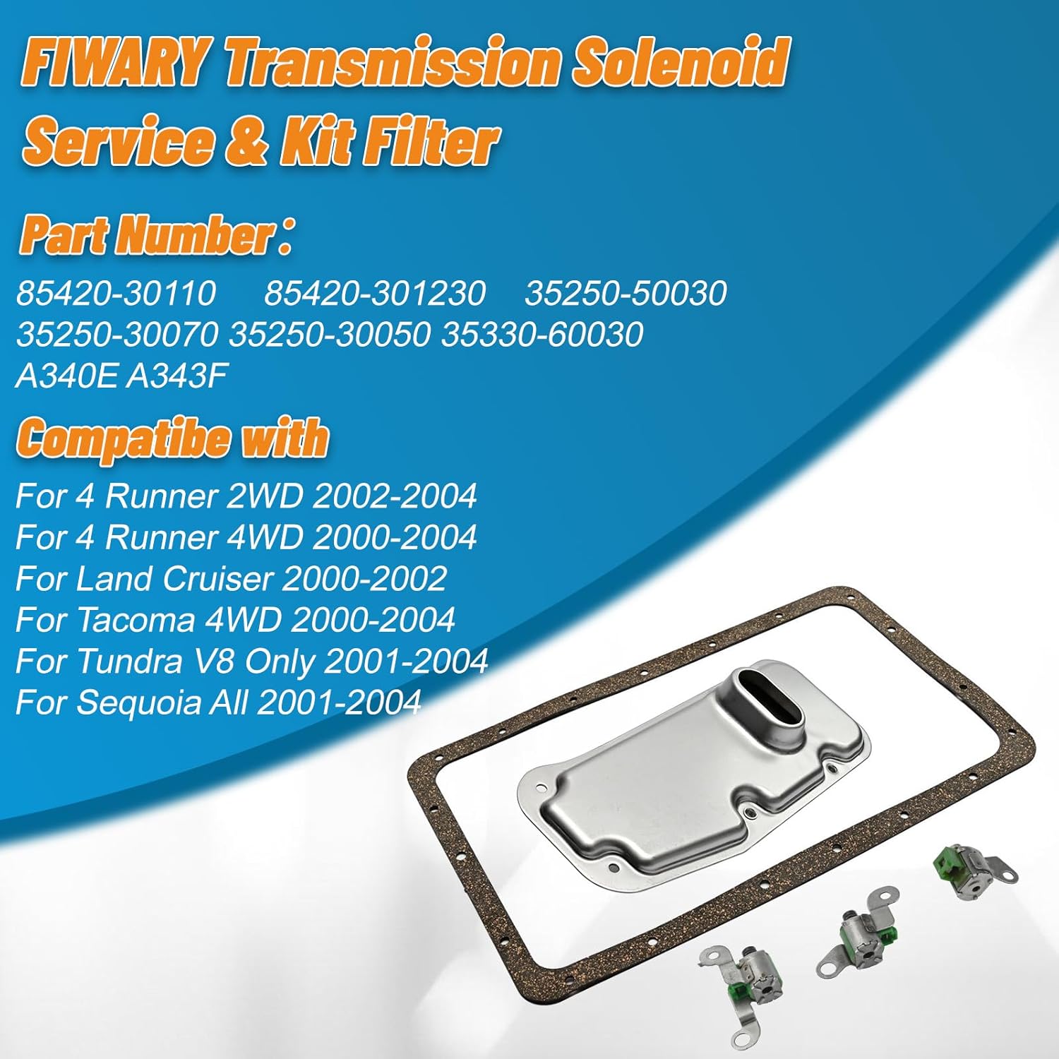 O Serviço de Solenoide de Transmissão A340E A343F é uma solução essencial para proprietários de veículos 4-Runner 2WD e 4WD fabricados entre 2000 e 2004. Este kit inclui um solenoide de transmissão de alta qualidade e um filtro, projetados para garantir o funcionamento ideal da transmissão do seu veículo. Com um design robusto e componentes de alta qualidade, este produto oferece desempenho superior e confiabilidade, sendo capaz de suportar as condições mais adversas.