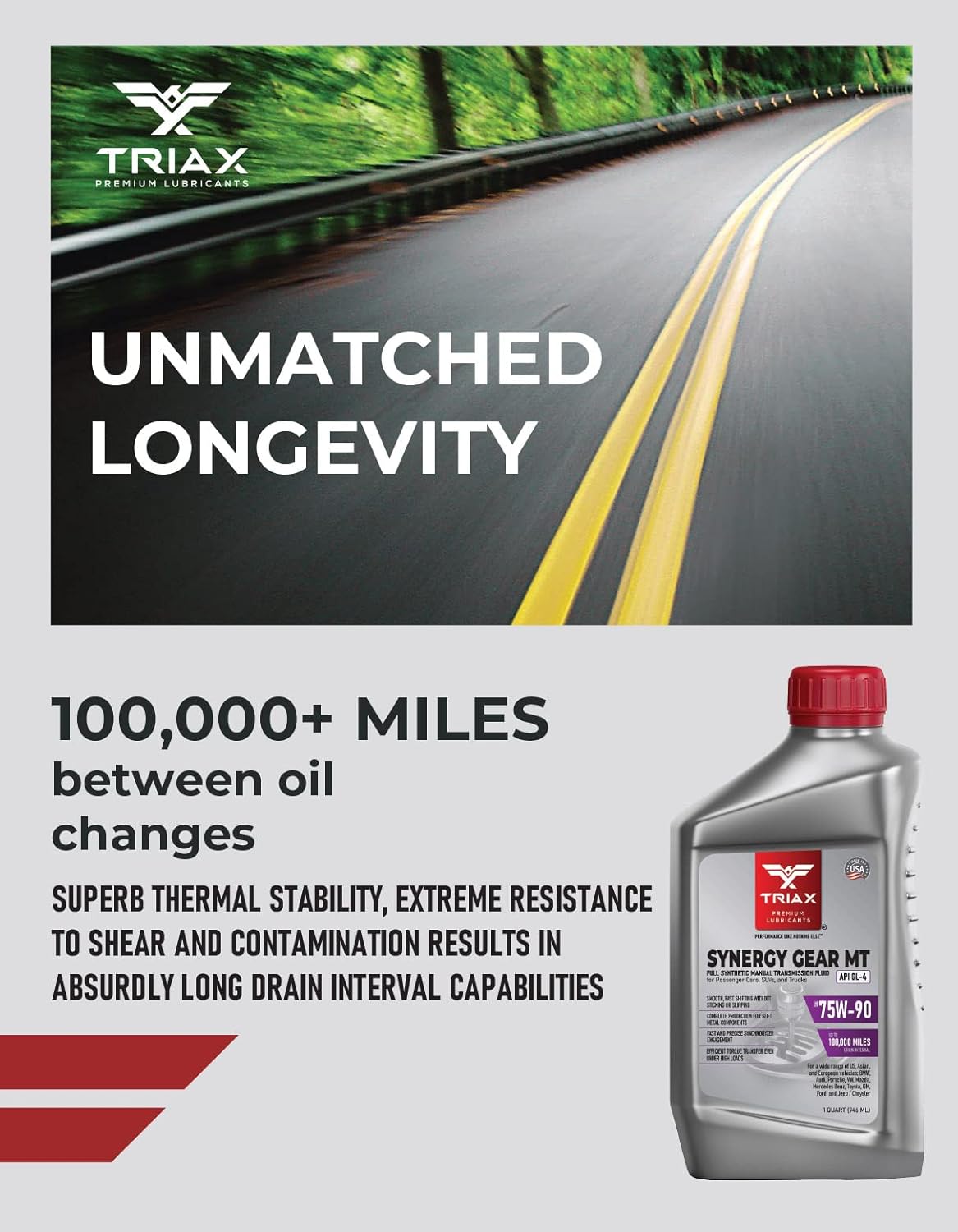 Este fluido não é apenas uma solução para o dia a dia; ele oferece proteção excepcional em condições de alta potência e alta velocidade, suportando cargas mecânicas e térmicas sustentadas, como em corridas e situações off-road. Com intervalos de troca extremamente longos, capazes de ultrapassar 150.000 milhas, o TRIAX Synergy Gear MT 75W-90 GL-4 (MT-90) é a escolha ideal para quem busca durabilidade e eficiência.