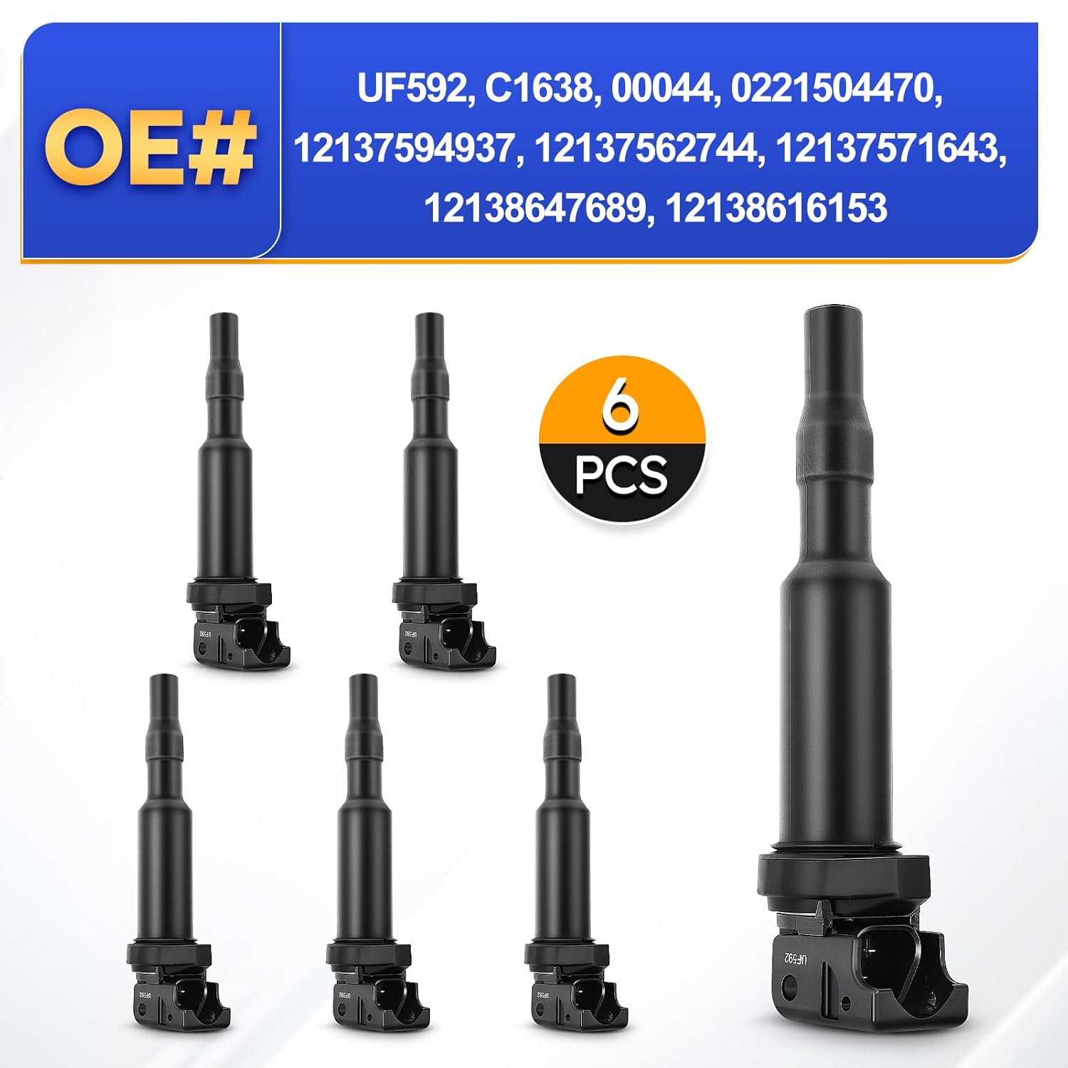 - ✔️ Número OE: UF592. Substitui OE# C1638, 00044, 0221504470, 12137594937, 12137562744, 12137571643, 12138647689, 12138616153. O pacote inclui 6 bobinas de ignição. Manual de instruções, velas de ignição e parafusos não estão incluídos. A instalação é fácil e rápida.