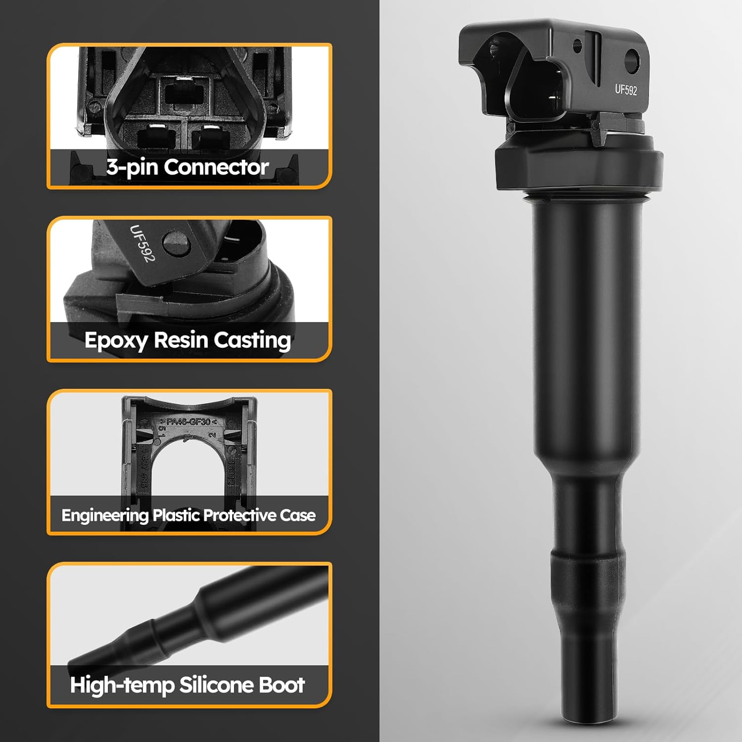 - ✔️ Alta Qualidade: Fabricada com materiais de primeira linha, a bobina de ignição possui uma mola de aço inoxidável com um supressor de ruído interno que previne interferências de radiofrequência. O conector de bobina termoplástico avançado garante uma conexão adequada e resiste a fraturas causadas pelo calor e ciclos térmicos, melhorando a transferência da alta voltagem gerada pelas velas de ignição do motor.