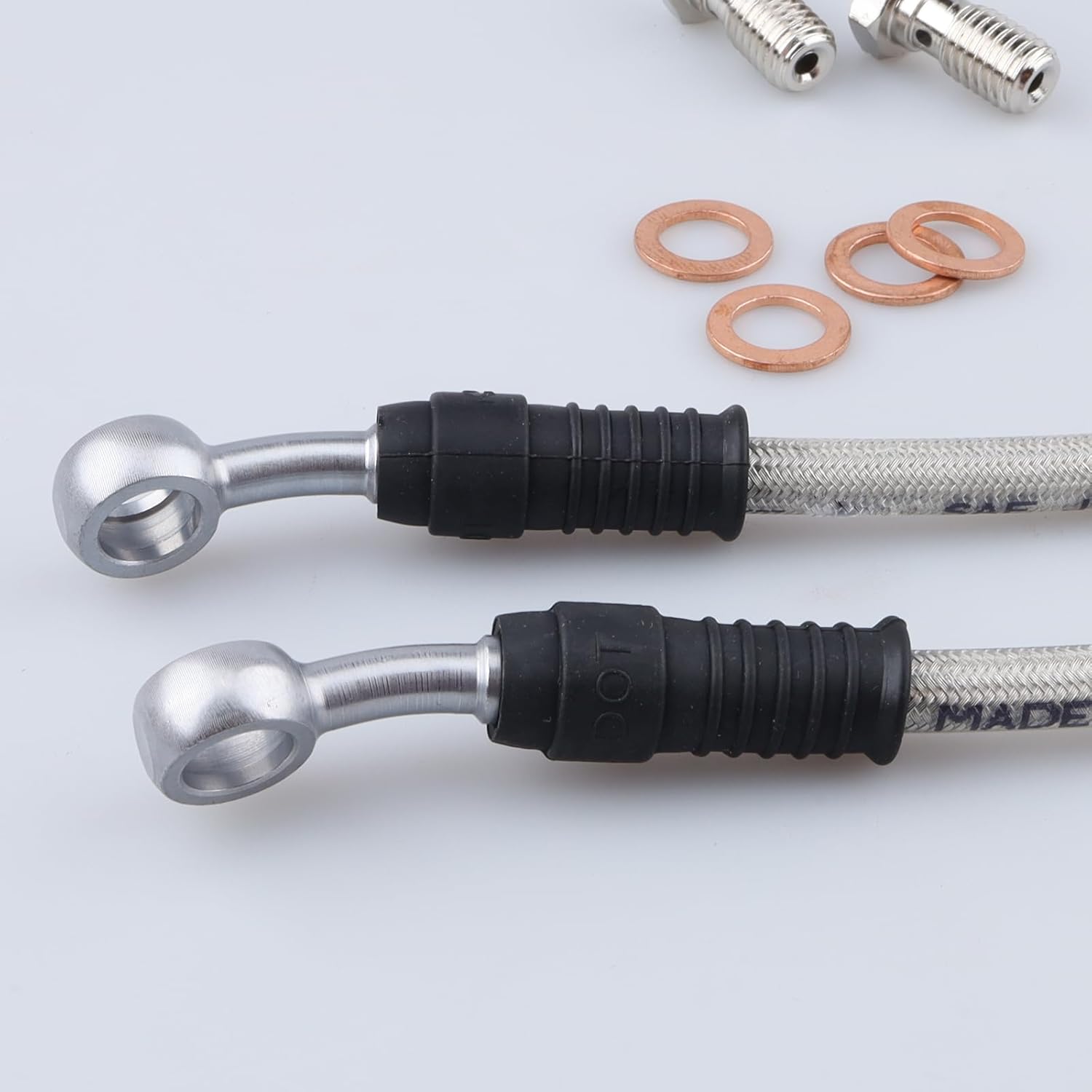 – Material: Mangueira de freio feita de PTFE com revestimento de aço inoxidável em PVC.