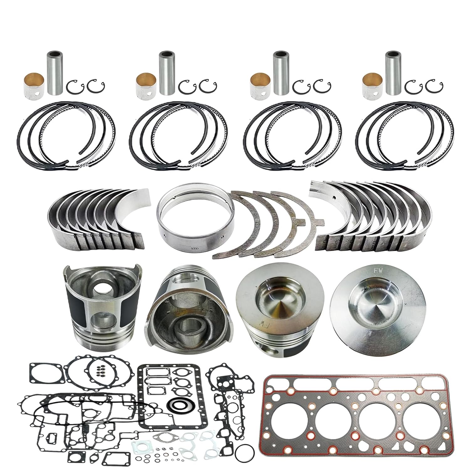Resposta: O kit inclui anéis de pistão, rolamentos do virabrequim, rolamentos da biela e arruelas de empuxo, todos em tamanhos padrão.