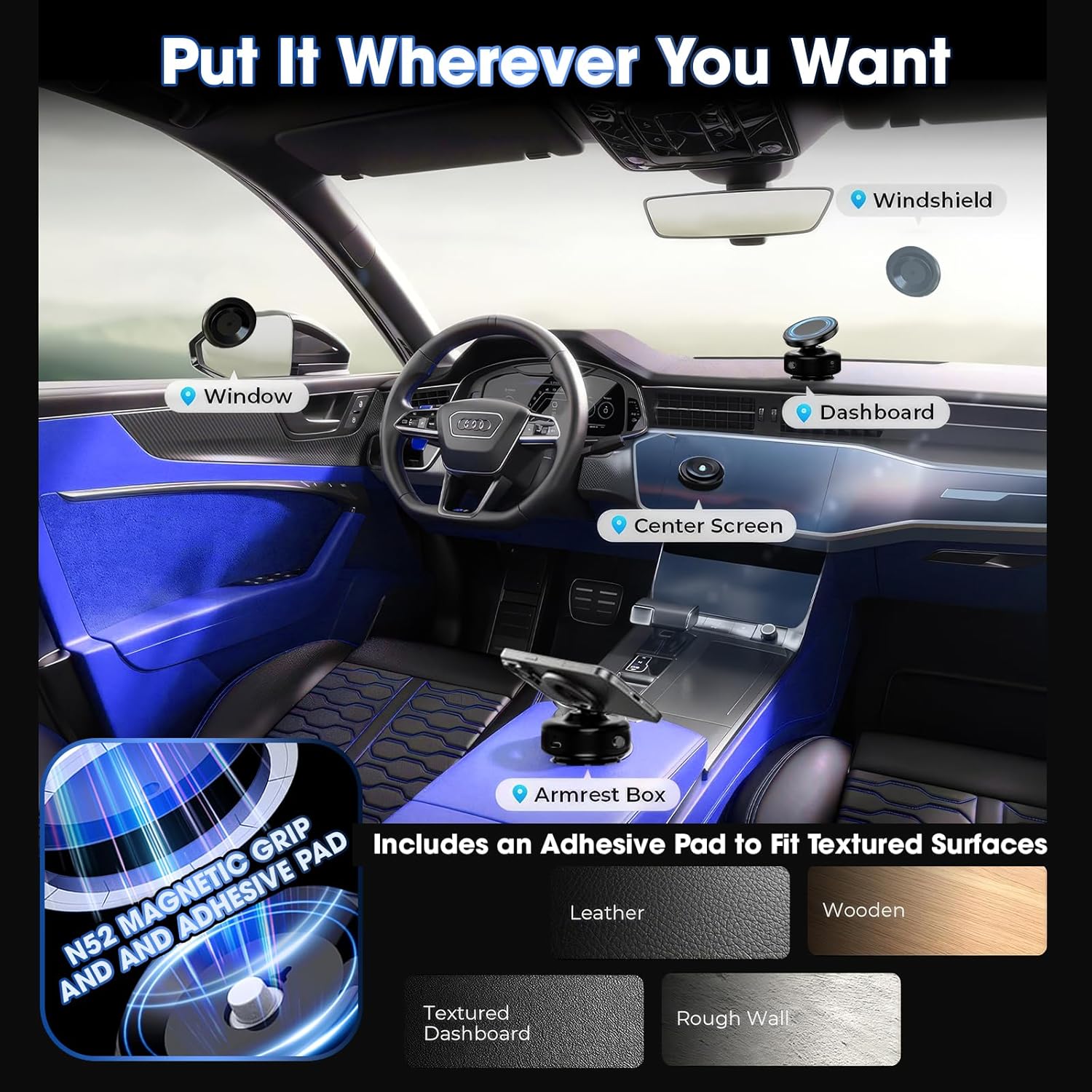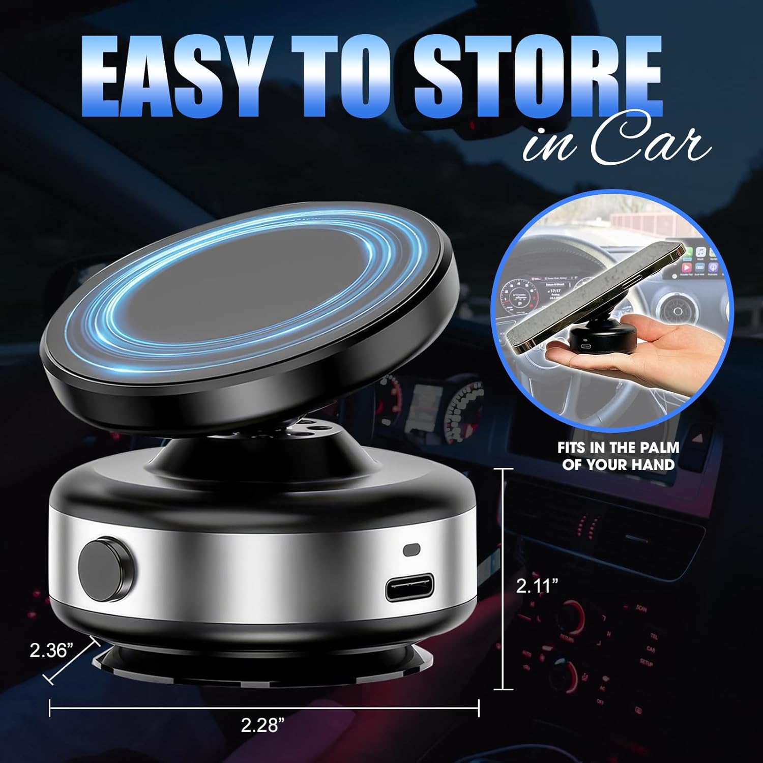 360-degree Adjustable, Powerful N52 magnetic force, Automatic adsorption by electric vacuum