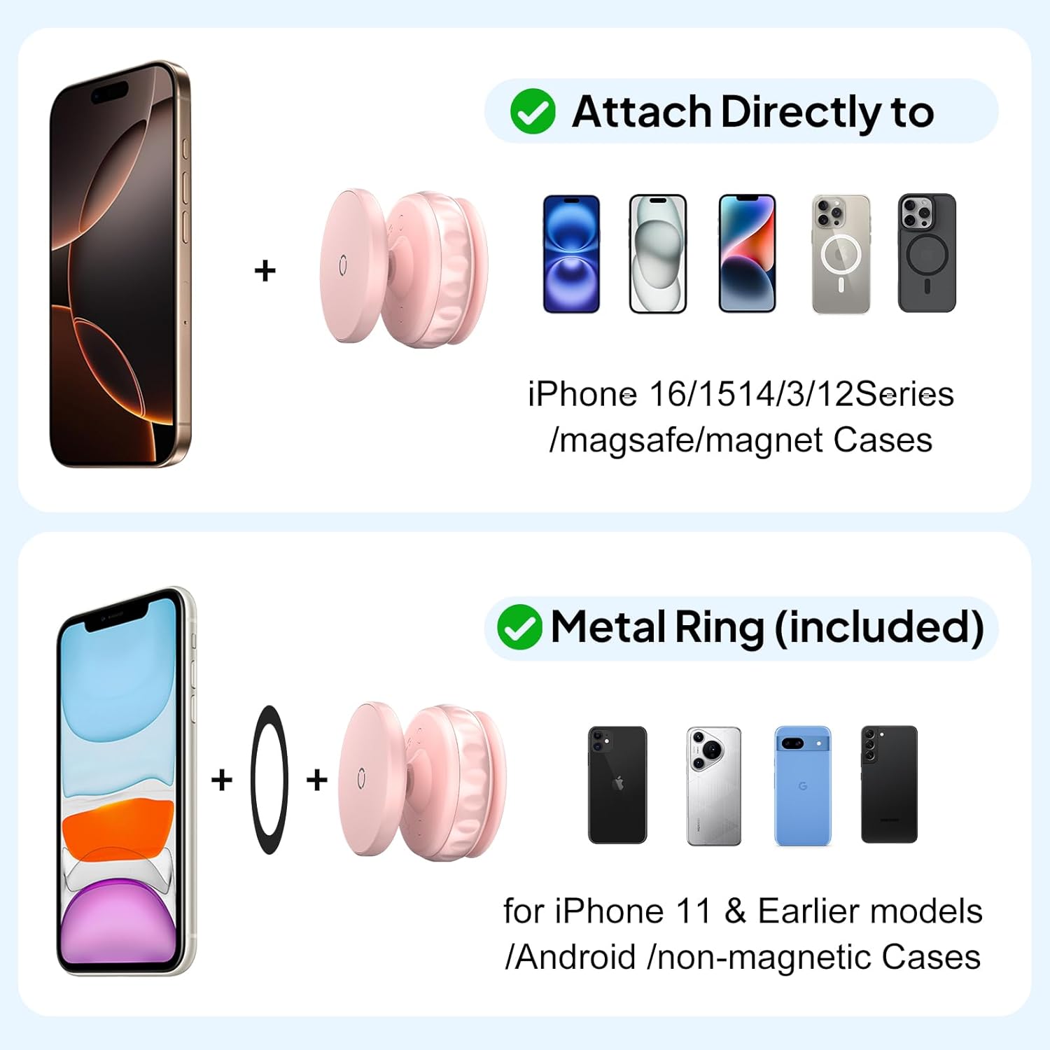 Compatível com iPhone 16/15/14/13/12 e séries Pro Max mini, nosso suporte também inclui anéis metálicos para celulares e capas não magnéticas. Basta colar o anel metálico na parte de trás do telefone, tornando-o compatível com iPhone, Android e todos os smartphones.