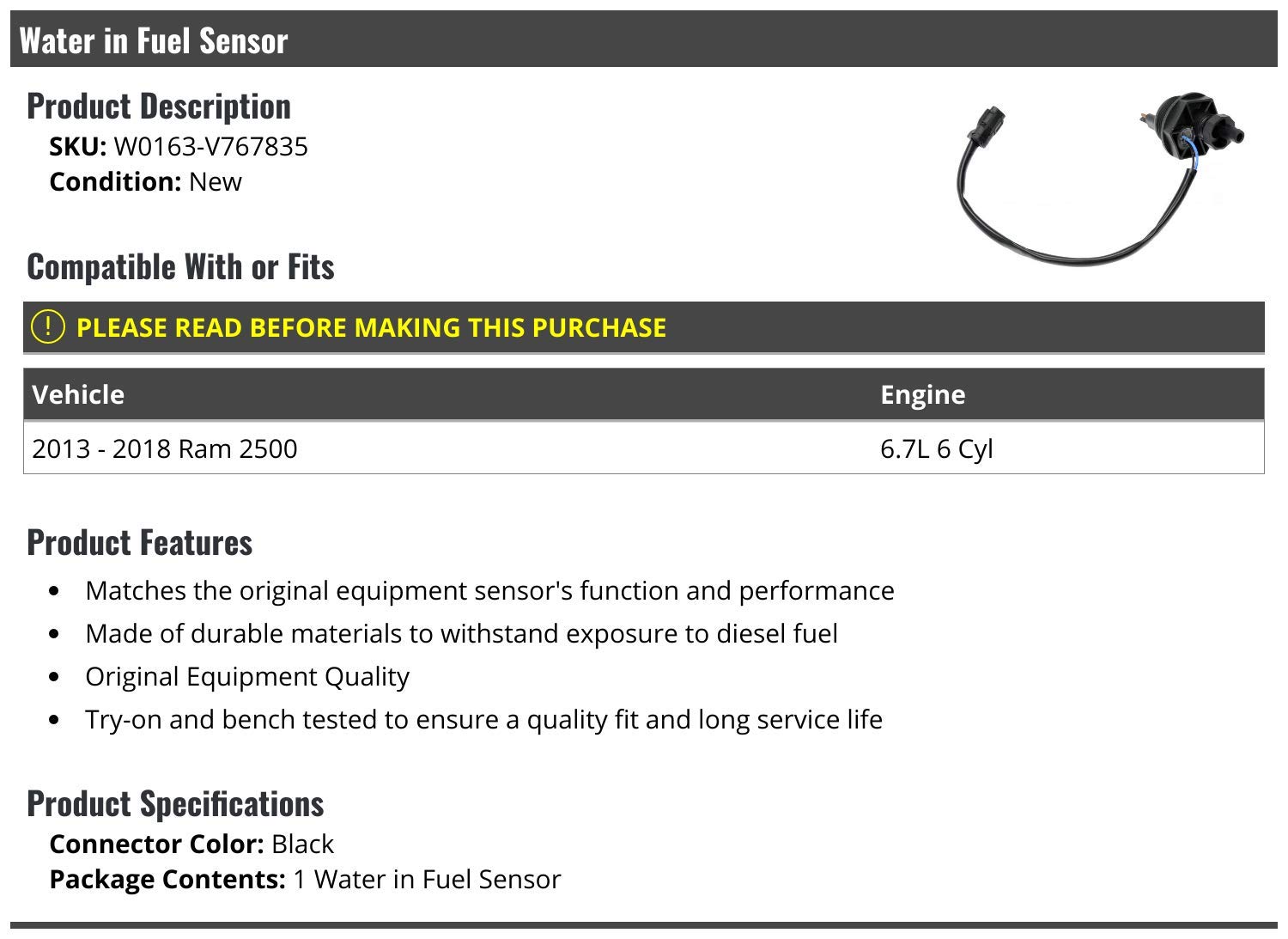 14 avaliações para Sensor de Água no Combustível – Compatível com Ram 2500 6.7L 2013-2018 6 Cilindros