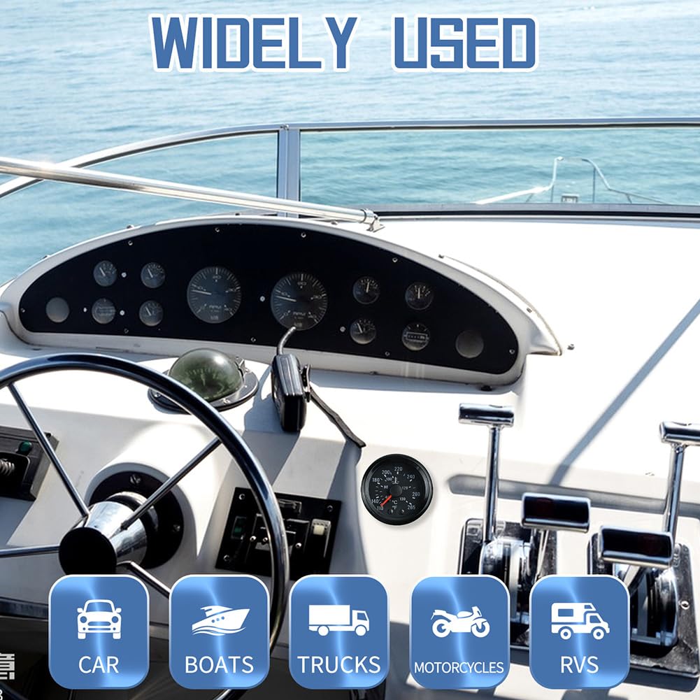 Este medidor de temperatura é amplamente utilizado em uma variedade de veículos, incluindo carros, caminhões, tratores, barcos, motocicletas, RVs, SUVs, ATVs e caravanas, tornando-se uma escolha versátil para qualquer entusiasta automotivo ou profissional.