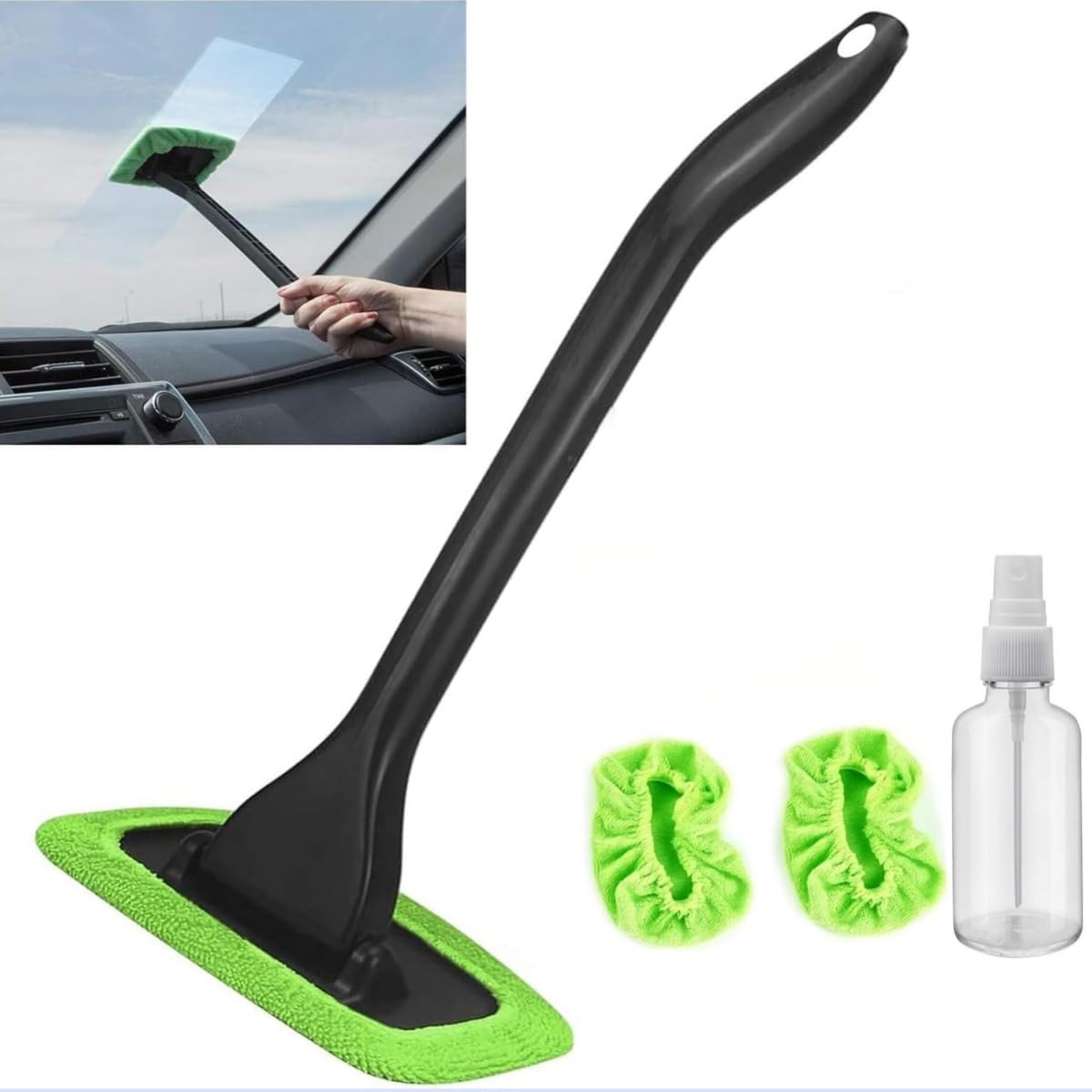 Ferramenta de Limpeza de Para-brisa: Acessório prático para limpeza de janelas de carro, inclui uma vara de limpeza, um frasco spray e 2 pads de pano reutilizáveis. Ideal para manter o interior do carro limpo, remove sujeira e manchas com facilidade. Design ergonômico e eficiente, permite alcançar áreas difíceis. Os pads são laváveis, promovendo sustentabilidade. Perfeito para quem busca agilidade e eficácia na limpeza automotiva.