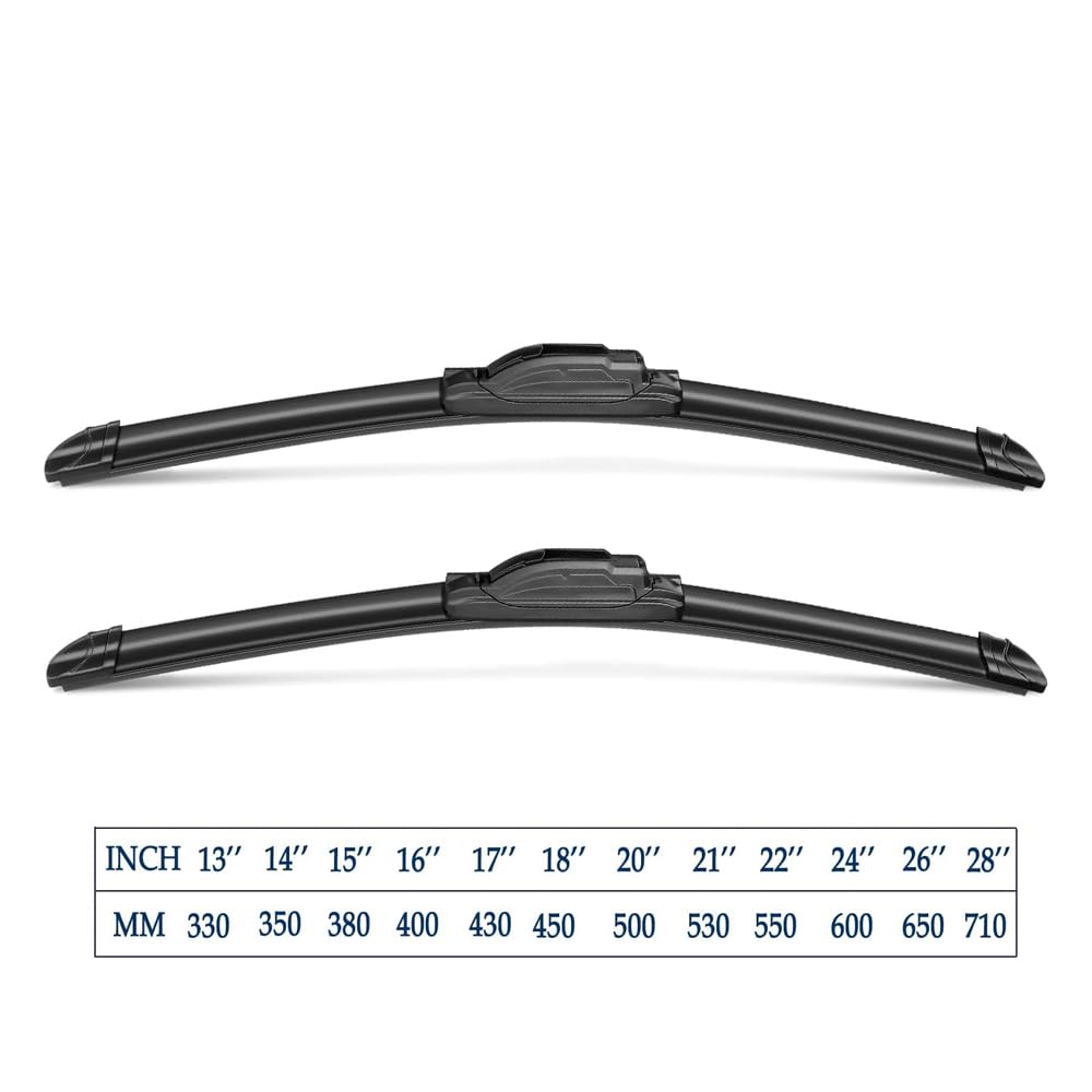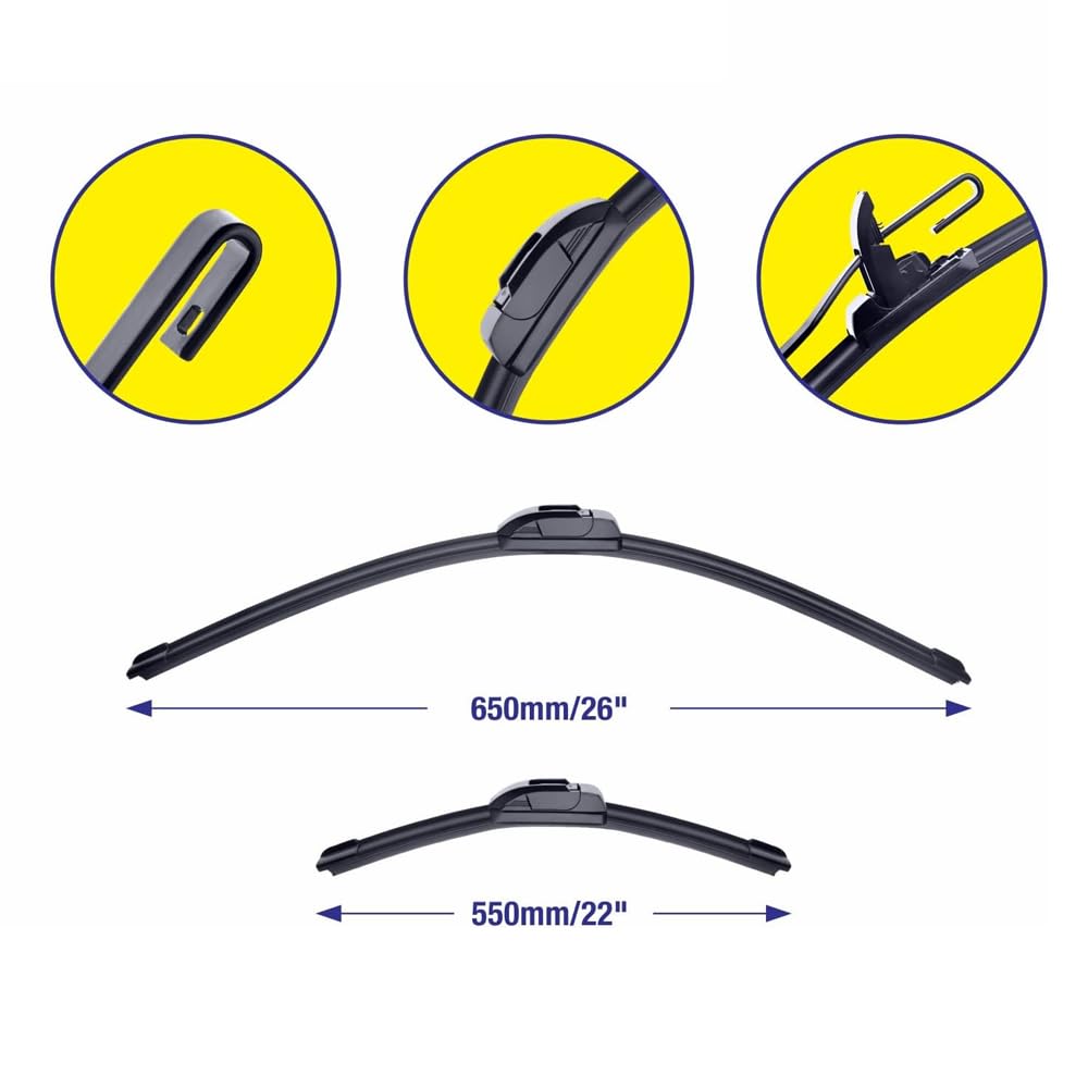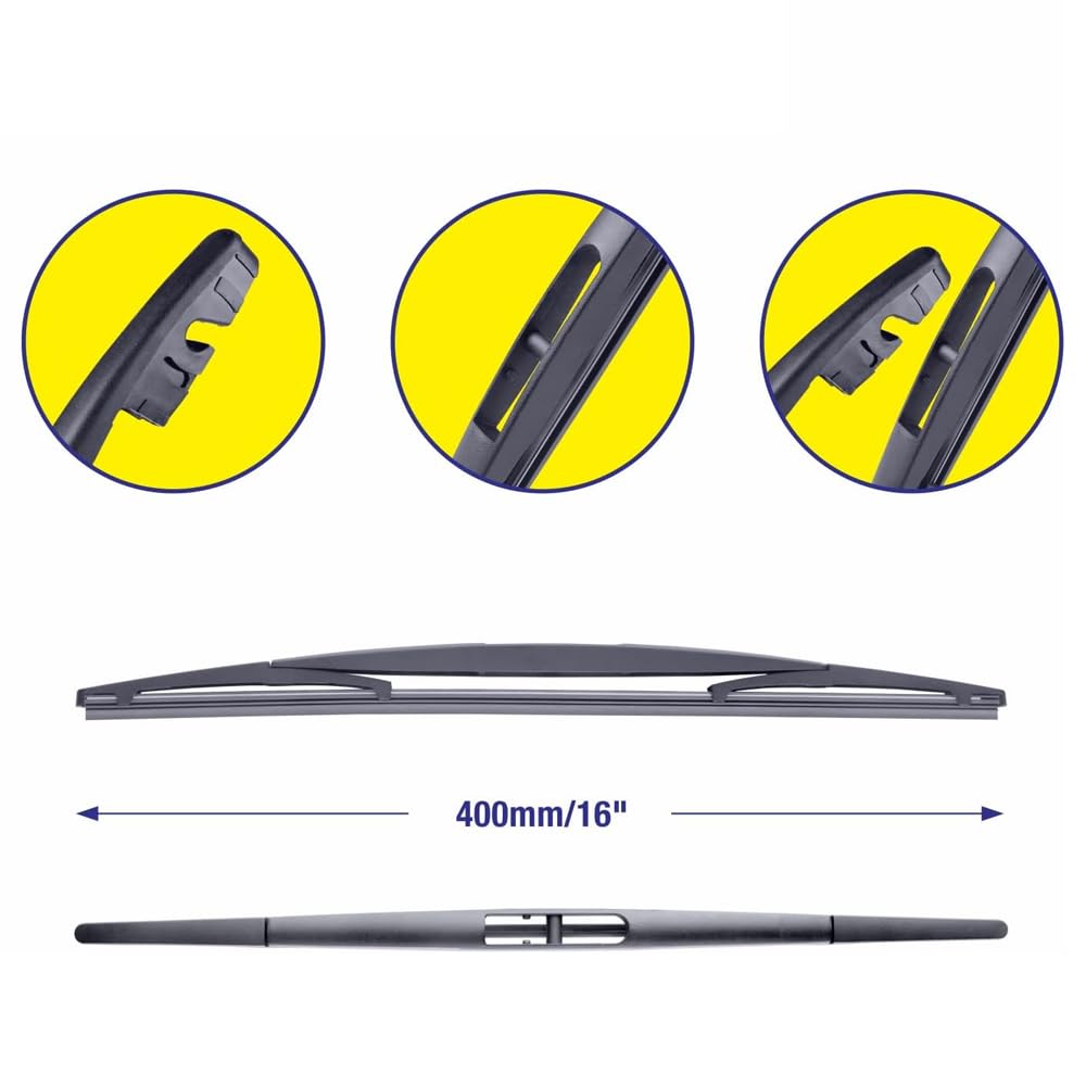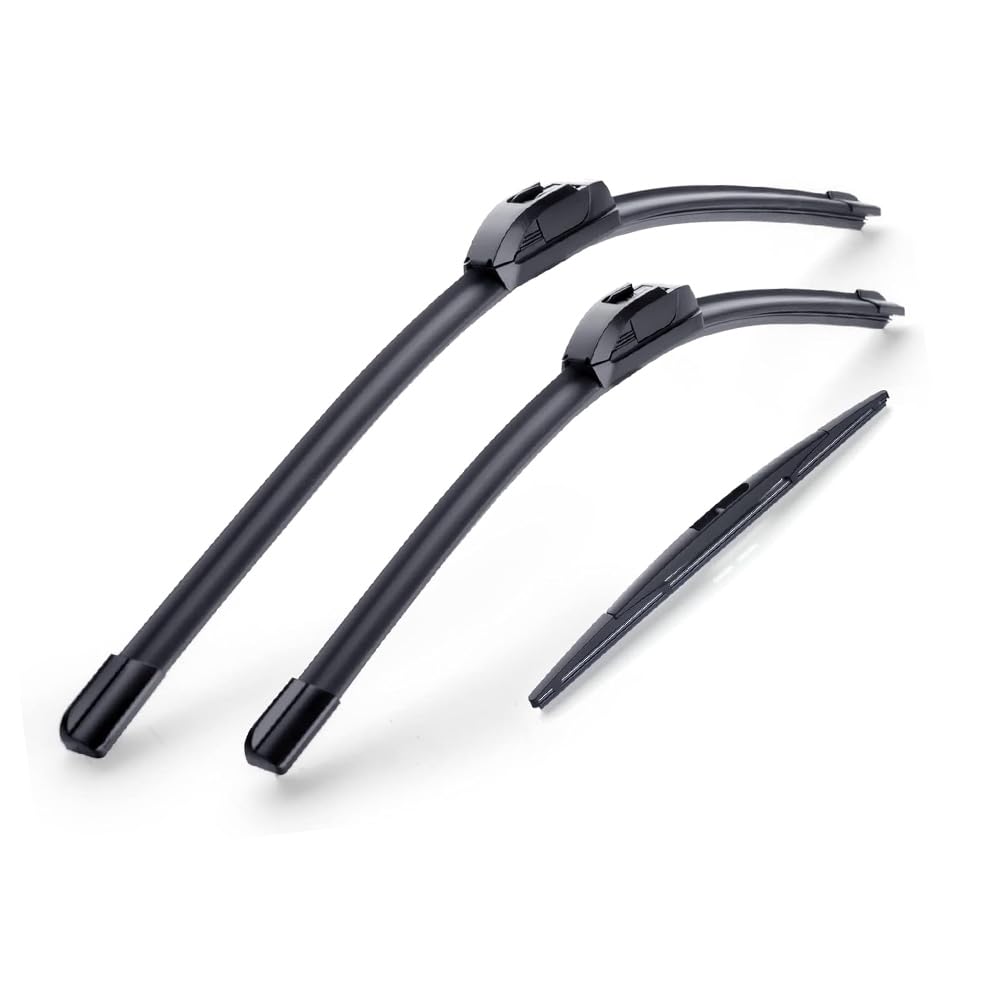 • Incluso: Conjunto completo de 3 lâminas (lâminas de limpador do para-brisa dianteiro + lâmina do limpador traseiro) com tamanhos de 26″, 22″ e 16″.