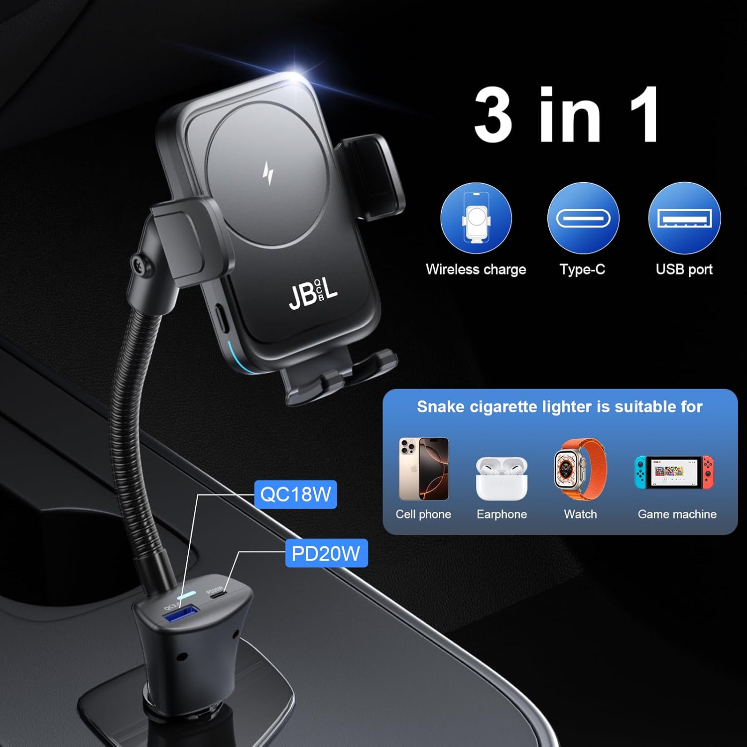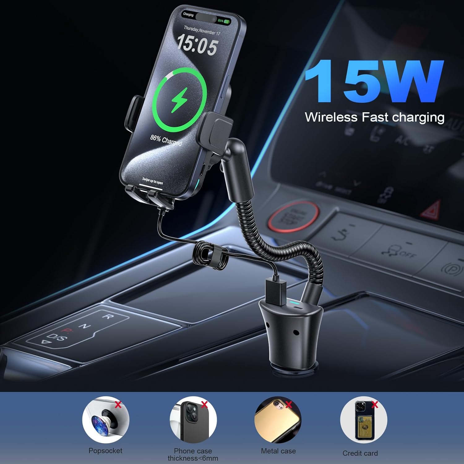 Combinando carregador sem fio e suporte, este produto elimina a necessidade de cabos bagunçados enquanto dirige. Ao ser colocado no porta-copos, não deixa manchas adesivas e não danifica o painel ou as lâminas do ventilador, garantindo a integridade do seu veículo.