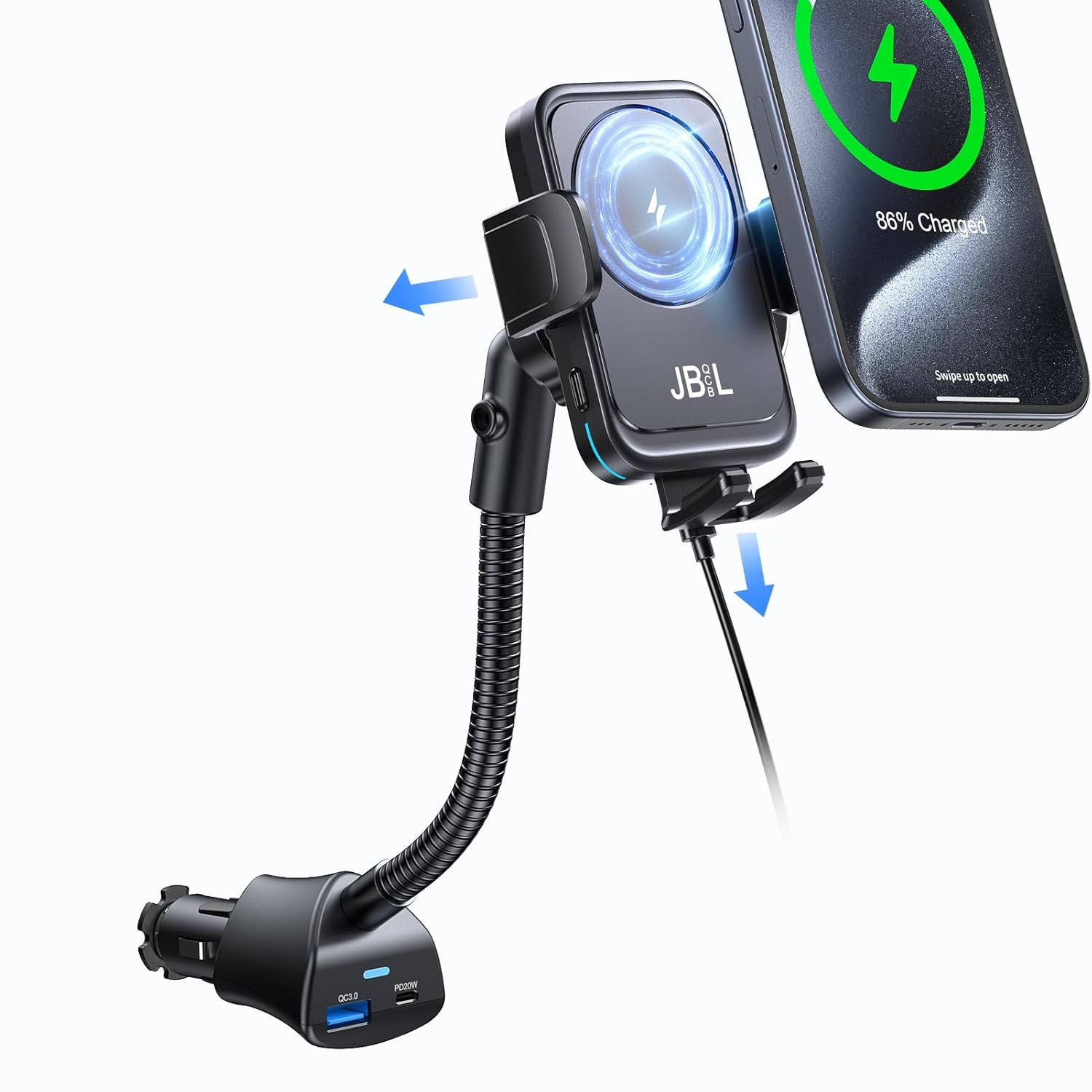 Carregador Veicular Sem Fio com Suporte para Isqueiro 15W – Carregamento Rápido e Auto Clamping. Este carregador oferece carregamento sem fio de 15W, garantindo uma recarga rápida e eficiente para dispositivos compatíveis. Possui montagem para isqueiro, facilitando a instalação em qualquer veículo. Com duas portas PD, permite carregar múltiplos dispositivos simultaneamente. O sistema de auto clamping ajusta-se automaticamente ao dispositivo, garantindo segurança e estabilidade durante a condução. Ideal para quem busca praticidade e eficiência no carregamento em movimento.
